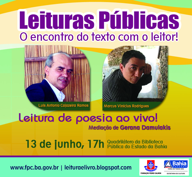 Apresentando sempre um ou mais autores para lerem as suas obras, o projeto Leituras Públicas receberá nesta quinta-feira, dia 13, às 17h, no quadrilátero da Biblioteca Pública do Estado, os poetas Luís Antônio Cajazeira Ramos e Marcus Vinicius Rodrigues. Contando com a mediação da escritora e critica literária Gerana Damulakis, os escritores também responderão, na ocasião, a perguntas feitas pelo público.