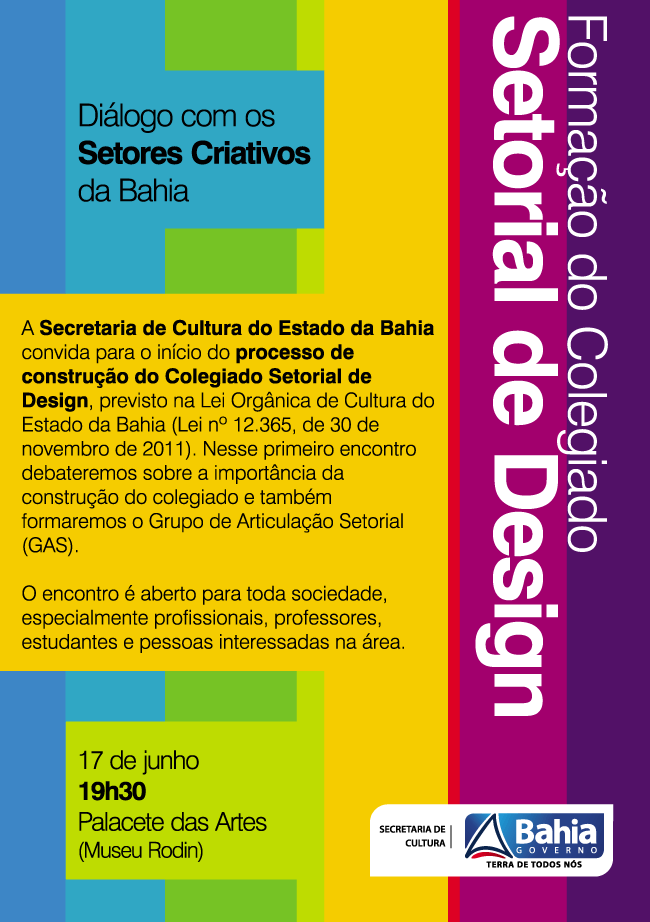Dando início ao processo de construção do Colegiado Setorial de Design, a Secretaria de Cultura do Estado da Bahia (SecultBA) convida a população para um encontro no qual será debatido a importância do Colegiado e a formação do Grupo de Articulação Setorial. O evento acontece na próxima segunda-feira, 17 de junho, às 19h30, no Palacete das Artes (Museu Rodin) – bairro Graça. Os profissionais, professores e estudantes da área participarão de palestra ministrada pelo assessor institucional da Fundação Cultural do Estado da Bahia (Funceb), Kuka Matos. A demanda para a criação do Colegiado Setorial de Design surgiu em 2011, quando da criação do Setorial das Artes, o é composto por áreas como Dança, Circo, Literatura, Música, teatro e Audiovisual. Os Colegiados Setoriais integram as ações do Sistema Estadual de Cultura e tem grande importância enquanto instância de consulta.
