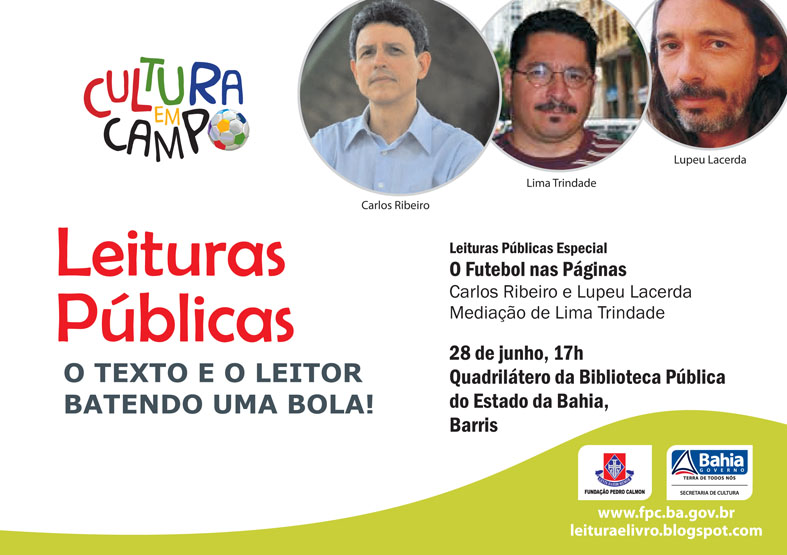 Em ritmo de Copa das Confederações, o projeto Leituras Públicas terá uma edição especial intitulada "O Futebol nas Páginas" e receberá os escritores Carlos Ribeiro e Lupeu Lacerda. Os autores lerão trechos de suas obras e responderão a perguntas do público, mediados pelo escritor Lima Trindade. O evento acontecerá no Quadrilátero da Biblioteca Pública da Bahia nesta sexta-feira (28), às 17h, com entrada gratuita.
