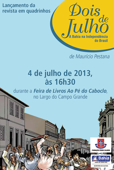 Hoje, dia 04, às 16h30, haverá lançamento da revista em quadrinhos Dois de Julho, a Bahia na Independência do Brasil, do cartunista Mauricio Pestana, que estará presente autografando a obra. Com 30 anos de carreira, Mauricio Pestana é publicitário, cartunista, escritor e roteirista, com trabalhos publicados no Brasil e no exterior. Pestana integra o Conselho Deliberativo do Baobá – Fundo para Equidade Racial, é membro do Conselho Administrativo do Museu Afro Brasil e preside o Conselho Editorial da Revista Raça Brasil, sendo diretor executivo da mesma.