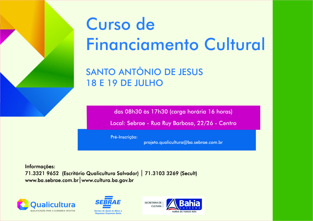 Estão abertas as inscrições para o curso de Financiamento Cultural, que será realizado em Santo Antônio de Jesus nos próximos dias 18 e 19 de julho, como parte das ações do projeto Qualicultura. Contando com carga horária de 16 horas, o curso é gratuito e fornece certificação. No total, serão oferecidas 30 vagas.