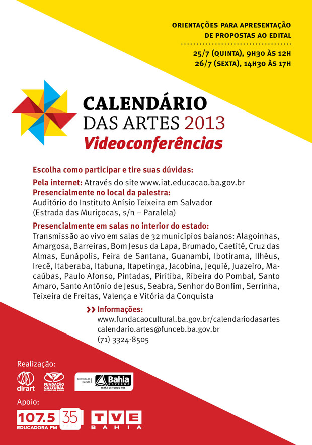 Para divulgar e dar instruções sobre a 2ª Chamada do Calendário das Artes 2013, a Fundação Cultural do Estado da Bahia (FUNCEB), entidade vinculada à Secretaria de Cultura do Governo do Estado (SecultBA), promotora do edital, vai realizar duas videoconferências: no dia 25 de julho (quinta-feira), no turno matutino (9h30 às 12 horas), e no dia 26 de julho (sexta-feira), no turno vespertino (14h30 às 17 horas). As videoconferências são conduzidas pela equipe da FUNCEB e podem ser acompanhadas ao vivo pela internet (no endereçowww.iat.educacao.ba.gov.br) ou em pontos de exibição localizados em 33 municípios baianos, incluindo o próprio local de transmissão das palestras – o auditório do Instituto Anísio Teixeira (IAT), em Salvador. Além de apresentar os conteúdos que focam especialmente em como preencher o Formulário de Inscrição, único documento exigido para a apresentação de propostas ao Calendário das Artes, as videoconferências permitem o diálogo com os participantes, que podem tirar suas dúvidas. Isto é possível através de envio de perguntas pelo site, para aqueles que acompanharem via internet, ou pelos mediadores presentes nas salas de transmissão, para aqueles que comparecerem aos locais. Estes momentos de orientação direcionada são mais uma iniciativa que busca facilitar o acesso ao Calendário das Artes, mecanismo de incentivo a projetos artísticos e culturais de pequeno porte na Bahia, que objetiva estimular o desenvolvimento das artes no estado. Assim, o intuito é de dar informações mais detalhadas aos diversos interessados, para que eles possam concorrer aos prêmios de forma acertada. As videoconferências são realizadas em parceria com a Secretaria de Educação (SEC), através do programa Rede Educação, que democratiza ações educacionais com soluções tecnológicas que promovem a Educação à Distância. Sobre a participação nas Videoconferências – A participação nas Videoconferências do Calendário das Artes é gratuita e aberta a quaisquer interessados. Existem três formas de participar: Presencialmente no local da palestra – em Salvador, o auditório do Instituto Anísio Teixeira (IAT), onde as palestras são realizadas, tem capacidade para 50 pessoas. Presencialmente em salas no interior do estado – as videoconferências são transmitidas ao vivo em salas de mais 32 municípios: Alagoinhas, Amargosa, Barreiras, Bom Jesus da Lapa, Brumado, Caetité, Cruz das Almas, Eunápolis, Feira de Santana, Guanambi, Ibotirama, Ilhéus, Irecê, Itaberaba, Itabuna, Itapetinga, Jacobina, Jequié, Juazeiro, Macaúbas, Paulo Afonso, Pintadas, Piritiba, Ribeira do Pombal, Santo Amaro, Santo Antônio de Jesus, Seabra, Senhor do Bonfim, Serrinha, Teixeira de Freitas, Valença e Vitória da Conquista. Nestes locais, um técnico possibilitará a intervenção dos presentes através de sistema online. Os endereços das salas estão disponíveis no site do Calendário das Artes:www.fundacaocultural.ba.gov.br/calendariodasartes, no link “Videoconferências do Calendário das Artes”. Pela internet – cidadãos conectados à internet em qualquer lugar do mundo podem acompanhar ao vivo o encontro e enviar perguntas, através do sitewww.iat.educacao.ba.gov.br. É só acessar e entrar no link “Videoconferência – Acesse aqui”, nas datas e horários definidos. Sobre o Calendário das Artes – Abrangendo as áreas de Artes Visuais, Audiovisual, Circo, Dança, Literatura, Música, Teatro e Artes Integradas, o Calendário das Artes é um mecanismo de incentivo a projetos artísticos e culturais de pequeno porte na Bahia. Concede prêmios de até R$ 13 mil e prioriza propostas oriundas e/ou realizadas em benefício de populações com menor acesso a produtos culturais e que privilegiem a diversidade cultural. As inscrições para a 2ª Chamada desta edição 2013 estão abertas até 5 de agosto, recebendo propostas de ações para serem iniciadas entre os dias 15 de outubro e 15 de dezembro deste ano. Serão no mínimo 49 contemplados, somando um investimento total de R$ 637 mil, com previsão de que sejam pelo menos sete propostas premiadas de cada um dos seis Macroterritórios da Bahia, excetuando-se a cidade de Salvador, para a qual existe uma categoria específica que vai apoiar ao menos sete propostas da capital.  Para tanto, a avaliação dos projetos é feita de forma territorializada, com concorrência e comissões de seleção específicas em cada Macroterritório. O edital do Calendário das Artes, bem como seus anexos e orientações, está disponível no site www.fundacaocultural.ba.gov.br/calendariodasartes. Videoconferências Calendário das Artes Quando: 25 de julho (quinta-feira), 9h30 às 12 horas 26 de julho (sexta-feira), 14h30 às 17 horas Onde: = Presencialmente no local da palestra Auditório do Instituto Anísio Teixeira (IAT) – Estrada das Muriçocas, s/n – Paralela, Salvador/BA. = Presencialmente em salas de 32 cidades do interior do estado Acesse locais e endereços www.fundacaocultural.ba.gov.br/calendariodasartes = Pela internet Através do site www.iat.educacao.ba.gov.br Quanto: Grátis Realização: FUNCEB/ SecultBA – IAT/ SEC Apoio: Educadora FM/ TVE Bahia/ IRDEB