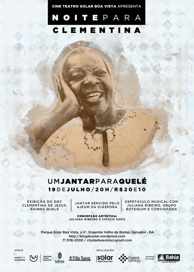 Homenageada da edição passada do Julho + SOLAR, Clementina de Jesus ganha mais uma noite de tributo, este ano em seu aniversário de morte. Na próxima sexta-feira (19), dia em que se completa 26 anos de morte da sambista, a partir das 20h, acontece Um Jantar para Quelé, que será comandada pela cantora e compositora Juliana Ribeiro. A Noite para Clementina começa com a exibição do documentário “Rainha Quelé”, do diretor paulista Werinton Kermes, que também estará presente no evento. A programação tem como foco os hábitos de Clementina, principalmente sua comida preferida. O projeto Ajeúm da Diáspora será o responsável pelo jantar, que traz no cardápio, “Oitili” (bolinho de feijão) e “Angú à Quelé”. Além do jantar, muita música e dança ao som de Juliana Ribeiro que, juntamente com o Grupo Botequim, recebe diversos convidados como Grupo Barlavento, Mariella Santiago, Claudya Costta, Belpa, Grupo Tapuia, Lia Chaves, Fael I, Carlos Barros, Vércia Gonçalves, Chita Fina, Ênio Bernardes, Jonga Lima, entre outros. Referência para a musicalidade afro-brasileira, a rainha Quelé, como também era conhecida a sambista, nasceu em Valença, no Rio de Janeiro e foi descoberta como cantora apenas aos 62 anos. Dona de casa e empregada doméstica, Clementina teve contato com a música desde criança, quando ouvia sua mãe entoar antigos cânticos de escravos; e cantava sempre durante seus afazeres na casa de família em que trabalha. Com sua voz grossa e marcante, Clementina foi a responsável por levar o vissungo, o jongo e o maracatu aos palcos brasileiros, mesclando com samba. PROGRAMAÇÃO 19 de Julho (Sexta-feira) - Noite para Clementina 20h - Exibição do filme Rainha Quelé, de Werinton Kermes 21h - Um jantar para Clementina - projeto Ajeúm da Diáspora 21h - Show Juliana Ribeiro com Grupo Botequim e convidados SERVIÇO “Noite para Clementina / Um Jantar para Quelé” – Julho + SOLAR 19 de julho Ingressos: R$ 20 (com direito a jantar); R$ 10 (sem o jantar) Cine Teatro Solar Boa Vista – Parque Boa Vista de Brotas, Engenho Velho de Brotas – Salvador – Bahia – (71) 3116-2000 www.blogdosolar.wordpress.com