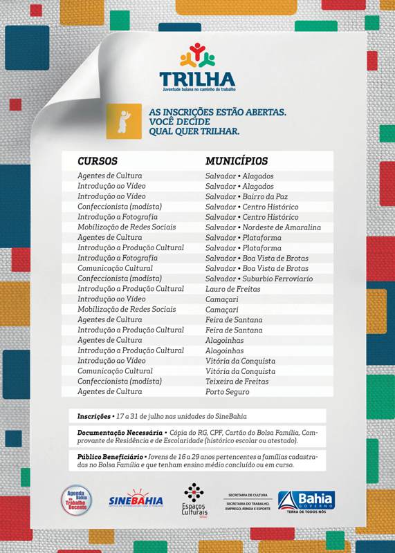 A Secretaria do Trabalho, Emprego, Renda e Esporte (Setre), com apoio da Secretaria de Cultura do Estado da Bahia (SecultBA), abriu  as inscrições para 3,5 mil vagas em cursos gratuitos de qualificação, entre eles, na área cultural. São 37 cursos do Programa Trilha 2013, em 25 municípios, destinados a beneficiários do programa Bolsa Família que tenham entre 16 e 29 anos. Do total de oportunidades, para a Região Metropolitana de Salvador são 1.590 para a capital, 100 para Lauro de Freitas, 100 para Camaçari, 100 para Itaparica e 50 para Mata de São João. Os cursos terão carga horária de 400 horas/aula, sendo 100 de Qualificação Social, 250 de Qualificação Profissional, e mais 50 para orientação e elaboração do Trabalho Final de Curso (TFC). As aulas começam em agosto e têm duração de cinco meses. As inscrições podem ser feitas até o dia 31 de julho, nas unidades do SineBahia presentes nos municípios. É necessário preencher a ficha no local, apresentando cópia do RG, CPF, Cartão do Bolsa Família (do inscrito ou do responsável), e os comprovantes de escolaridade e residência. Vale ressaltar que não haverá curso noturno e que as convocações dos jovens selecionados serão feitas por telefone.