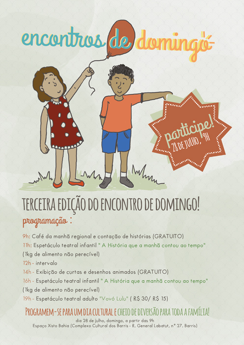 Em mais uma edição do projeto Encontros de Domingo, o Espaço Xisto Bahia prepara, para o próximo dia 28 de julho, uma programação diversificada para toda a família, afinal, domingo é um bom dia para reuni-la. Logo pela manhã, às 9h, será servido um delicioso café da manhã regional para a família, seguido de contação de histórias – indicado para crianças a partir de dois anos – e uma sessão extraordinária do espetáculo teatral “A história que a manhã contou ao tempo”, às 11h. Ingressos podem ser trocados por 1kg de alimento não perecível na bilheteria do Espaço.