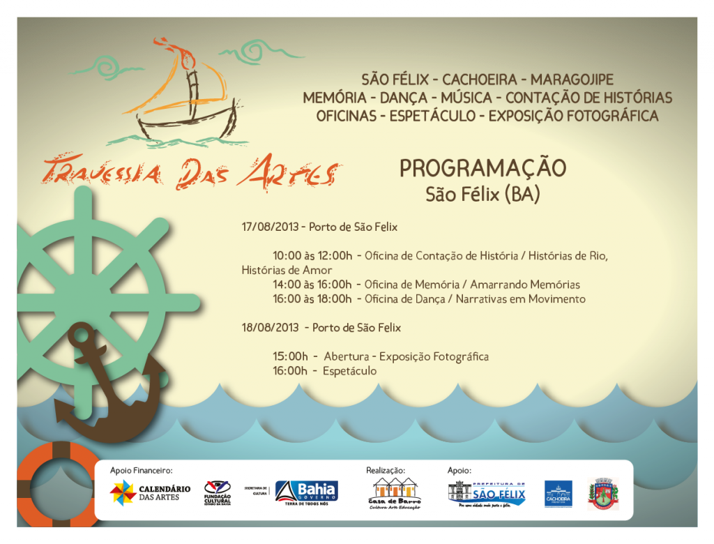 Depois de passar nas comunidades do Pilar, Iguape e Ponta de Souza, o Travessia das Artes finaliza seu percurso atracando no porto de São Félix, sábado e domingo, com oficinas de dança, memória e cotação de história, exposição fotográfica e o espetáculo Travessia da memória. No sábado as oficinas começam às 10:00 horas da manhã e seguem durante todo o dia. Domingo a abertura da exposição de fotografias das comunidades por onde o projeto passou começa às 15:00 horas, seguido pelo espetáculo, às 16:00 horas. O projeto é uma iniciativa da Casa de Barro, premiado pelo Calendário das Artes, e tem como proposta proporcionar a fruição da arte e da cultura para estas comunidades, estimular o desenvolvimento de formas de fazer arte e cultura a partir dos bens locais e provocar a investigação e valorização da memória oral do território sob metodologias arte-educativas. Tendo os artistas viajantes, crianças, adolescentes e comunidade como personagens centrais, as histórias orais e memórias do lugar se transformarão em enredo principal na contação de outras histórias. Ficha Técnica Espetáculo: Danielle Andrade, Flávia Pedroso, Rodrigo Paixão e Van (Bantos) Oficina de Memória: Amarrando Memórias -  Rodrigo Paixão Oficina de Dança: Narrativas em Movimento - Flávia Pedroso Oficina de Contação de Histórias: Memórias de Rio, Memórias de Amor - Danielle Andrade Produção Executiva: Patrícia Bssa Realização: Casa de Barro Cultura, Arte, Educação (para veículos)