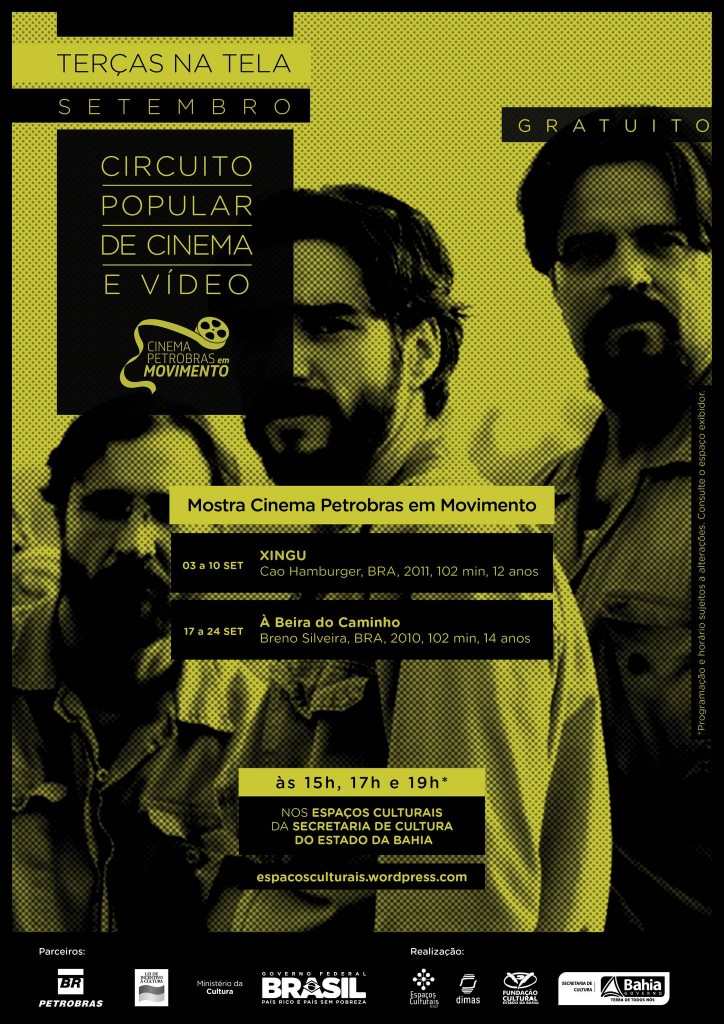 Nos próximos meses, em setembro e outubro, o CPCV traz a mostra Cinema Petrobrás em Movimento, com filmes do Cine BR Petrobrás, para os Espaços Culturais da Secretaria de Cultura do Estado da Bahia. Os filmes Xingu, dirigido por Cao Hamburguer, À Beira do Caminho, de Breno Silveira e a animação Peixonauta – Agente Secreto da O.S.T.R.A, do diretor Paulo Tatit serão exibidos em 14 espaços culturais da capital e do interior, todas as terças-feiras, gratuitamente. Os Centros de Cultura de Guanambi, Itabuna e Espaço Xisto Bahia não participam da mostra.