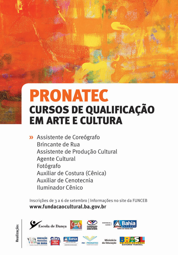 Numa parceria entre a Secretaria de Cultura (SEC) e a Secretaria de Educação do Estado da Bahia (SecultBA), a Escola de Dança, unidade do Centro de Formação em Artes da Fundação Cultural do Estado da Bahia (FUNCEB), oferece 200 vagas em oito cursos para jovens interessados em qualificar habilidades, ampliar conhecimentos e progredir na colocação enquanto trabalhador do setor artístico-cultural. Os cursos são realizados no âmbito do Programa Nacional de Acesso ao Ensino Técnico e Emprego (PRONATEC) do Ministério da Educação (MEC), numa ação conjunta com o Ministério da Cultura (MinC). As inscrições são gratuitas e ficam abertas em diferentes pontos da cidade, de 3 a 6 de setembro, conforme escalonamento. Os cursos são de Assistente de Coreografia, Assistente de Produção Cultural, Agente Cultural, Auxiliar de Cenotecnia, Fotografia, Iluminador Cênico, Costura (Cênica) e Brincante de Rua. A pretensão é de que talentos possam ser potencializados para abrir novas possibilidades de crescimento social e no mercado de trabalho, preparando pessoas para intervirem na sociedade de forma consciente e cidadã. Assim, aqueles que atuam amadoramente em atividades artísticas e culturais poderão se articular com mais reconhecimento na cadeia produtiva. Ou os que já sabem costurar, por exemplo, poderão ter uma qualificação específica para trabalhar com costura cênica, acrescentando ao currículo uma nova área de atuação. A ideia de coletivos também é importante: num grupo artístico em atividade, qual integrante poderia ser capacitado para desenvolver tarefas produtivas específicas, como, por exemplo, a de iluminador cênico, conferindo mais independência à equipe? Podem se inscrever maiores de 16 anos, sendo exigido nível de escolaridade que varia do Ensino Fundamental I incompleto ao Ensino Médio completo. Para este momento, basta que o candidato se apresente e preencha uma ficha de inscrição. Serão inscritos até três vezes o número de vagas disponíveis para cada turma, para posterior seleção dos participantes e definição de lista de espera com suplentes. A lista final de alunos será divulgada em 12 de setembro, no site da FUNCEB (www.fundacaocultural.ba.gov.br), sendo então feita a convocação para efetivação de matrícula. As aulas serão iniciadas em 23 de setembro e acontecerão de segunda a sábado, em turnos variados, durante três meses. A carga horária total dos cursos é de 240 horas e os alunos devidamente matriculados receberão auxílio transporte e de alimentação, além de todo material didático necessário. As disciplinas se iniciam com formação técnica geral – como ética, cidadania, comunicação, saúde e segurança do trabalho – e passam para conhecimentos específicos de cada área, com contextualização e fundamentos tecnológicos e instrumentais. Os certificados finais são reconhecidos pelo MEC. Às vésperas de completar 30 anos, a Escola de Dança da FUNCEB, instituição fundada em 1984, tem a competência necessária de ser ofertante conveniada ao PRONATEC. Isto é possível porque ela oferece cursos técnicos de nível médio regulares, reconhecidos pelo Conselho Estadual de Educação e pelo MEC, sendo, portanto, parte da rede estadual de educação profissional. ESCALONAMENTO DA PRÉ-INSCRIÇÃO