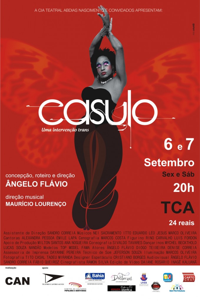 O espetáculo Casulo uma intervenção trans... apresenta o universo simbólico da população LGBT, tem concepção, direção e encenação de Ângelo Flávio e realização da Cia Teatral Abdias do Nascimento (CAN). O espetáculo que foi anteriormente idealizado para a Estação da Lapa, estreou em abril de 2013 atingindo sucesso de público e crítica, gerando grande repercussão nas mídias e na cena teatral baiana. Após vários pedidos nas redes sociais o espetáculo retorna em cartaz com duas apresentações únicas no Teatro Castro Alves (TCA), nos dias 06 e 07 de setembro (sexta e sábado), às 20h. Ingressos R$ 24 (inteira) e R$ 12 (meia) a venda nas bilheterias do TCA e nos SACs Barra e Iguatemi. A mudança de espaço do espetáculo não foi por acaso, para o diretor Ângelo Flávio, ocupar um teatro da representatividade como o TCA, tem uma relevância semiótica, pois para ele “um espetáculo que nasceu na Estação da Lapa, com um signo de gueto, marginalidade e submundo sob a ótica da sociedade conservadora, agora, vai ao TCA para romper com as estigmatizações, para desguetizar os fazeres da população LGBT e confrontar as fronteiras, reiventando lugares e resignificando pessoas”. Para ele o espetáculo que incorpora elementos estéticos de talk show e happening em uma intervenção experimental na Lapa deu certo porque tiveram a coragem de “correr o risco”, agora vai experimentar e brincar no TCA e, promete surpreender a plateia.
