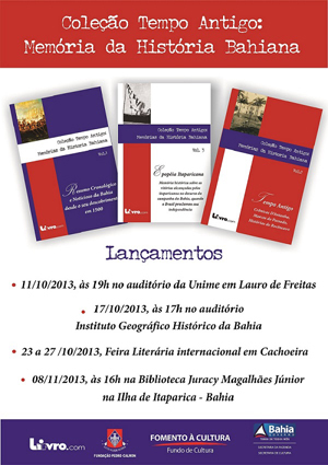 “A Coleção Tempo Antigo: Memórias da História Bahiana” será lançada na próxima sexta-feira, dia 11, às 19h, no auditório da Unime em Lauro de Freitas. Os três exemplares são Resumo Chronólogico e Noticioso da Província da Bahia desde o seu descobrimento em 1500, Tempo Antigo e Epopéia Itaparicana, publicados pela Editora Livro.Com, contemplado pelo edital N° 08/2012 de Apoio à Publicação de Livros por Editoras Baiana, da Fundação Pedro Calmon/SecultBA.