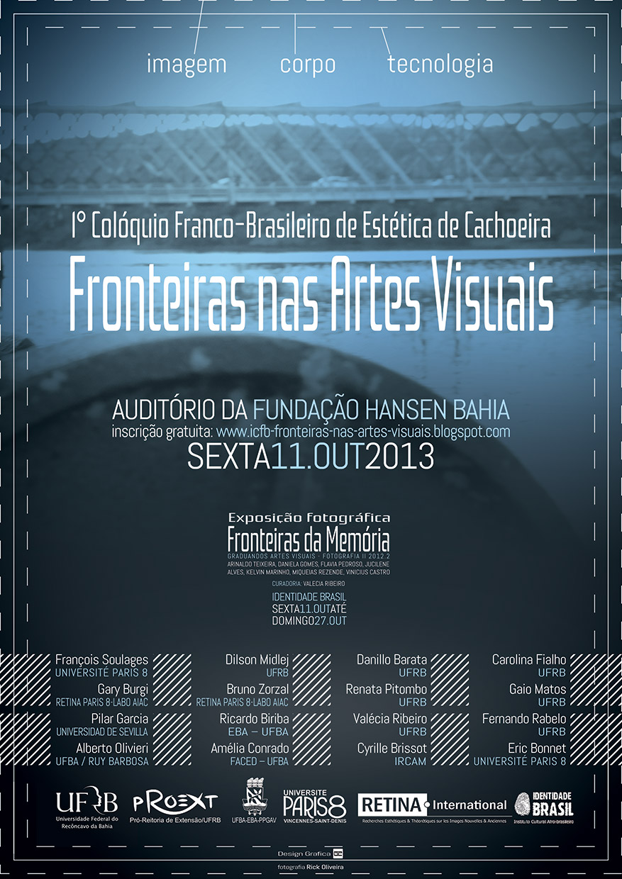 Nesta sexta-feira, 11, a partir das 8h30, acontece o I Colóquio Franco-Brasileiro de Estética de Cachoeira: Fronteiras nas Artes Visuais, no Auditório da Fundação Hansen Bahia, na cidade de Cachoeira. O evento faz parte das atividades do grupo de pesquisa RETINA.International em 2013, no ciclo de pesquisa “Dialogues Frontieres” (Diálogos de Fronteiras), e é uma realização da parceria entre a Université Paris 8, a Universidade Federal do Recôncavo da Bahia (CAHL-Artes Visuais) e a Universidade Federal da Bahia (PPGAV – EBA-Escola de Belas Artes).
