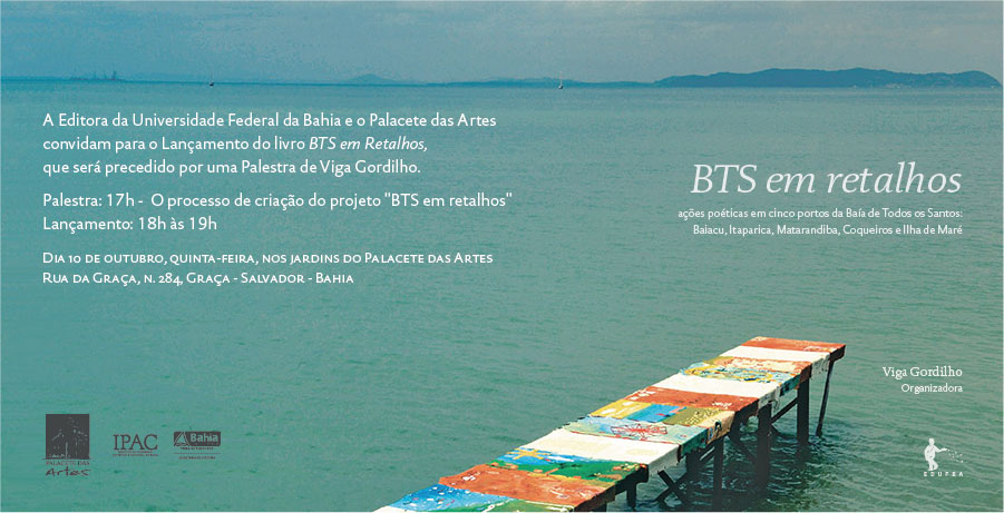 A Editora da Universidade Federal da Bahia (EDUFBA) e o Palacete das Artes convidam para o lançamento do livro BTS em retalhos - ações poéticas em cinco portos da Baía de Todos os Santos: Baiacu, Itaparica, Matarandiba, Coqueiros e Ilha de Maré, organizado por Viga Gordilho, professora do Programa de Pós- Graduação em Artes Visuais da Escola de Belas Artes da Universidade Federal da Bahia. O evento acontece quinta-feira, 10 de outubro, nos jardins do Palacete das Artes, na Rua da Graça, em Salvador. Às 17 horas será ministrada a palestra O processo de criação do projeto “BTS em retalhos”, pela organizadora do livro e logo depois, às 18 horas, o lançamento da obra.