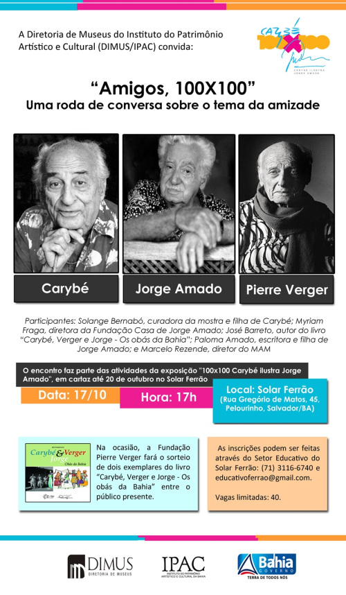 Estão abertas as inscrições para participar da roda de conversa Amigos, 100X100, que acontece na próxima quinta-feira (17), às 17h, no Solar Ferrão. O evento tem como proposta promover um bate-papo sobre a amizade entre Jorge Amado, Carybé e Pierre Verger. Participam desse bate-papo: Solange Bernabó, curadora da mostra e filha de Carybé; Myriam Fraga, diretora da Fundação Casa de Jorge Amado; José Barreto, autor do livro “Carybé, Verger e Jorge – Os obás da Bahia”; Paloma Amado, escritora e filha de Jorge Amado; e Marcelo Rezende, diretor do MAM que fará o papel de mediador. Amigos, 100X100 faz parte da programação educativa da mostra 100X100 Carybé ilustra Jorge Amado, em cartaz no Solar Ferrão até 20 de outubro. As inscrições podem ser feitas através do Setor Educativo do Solar Ferrão através do telefone (71) 3116-6740 ou do e-mail educativoferrao@gmail.com.