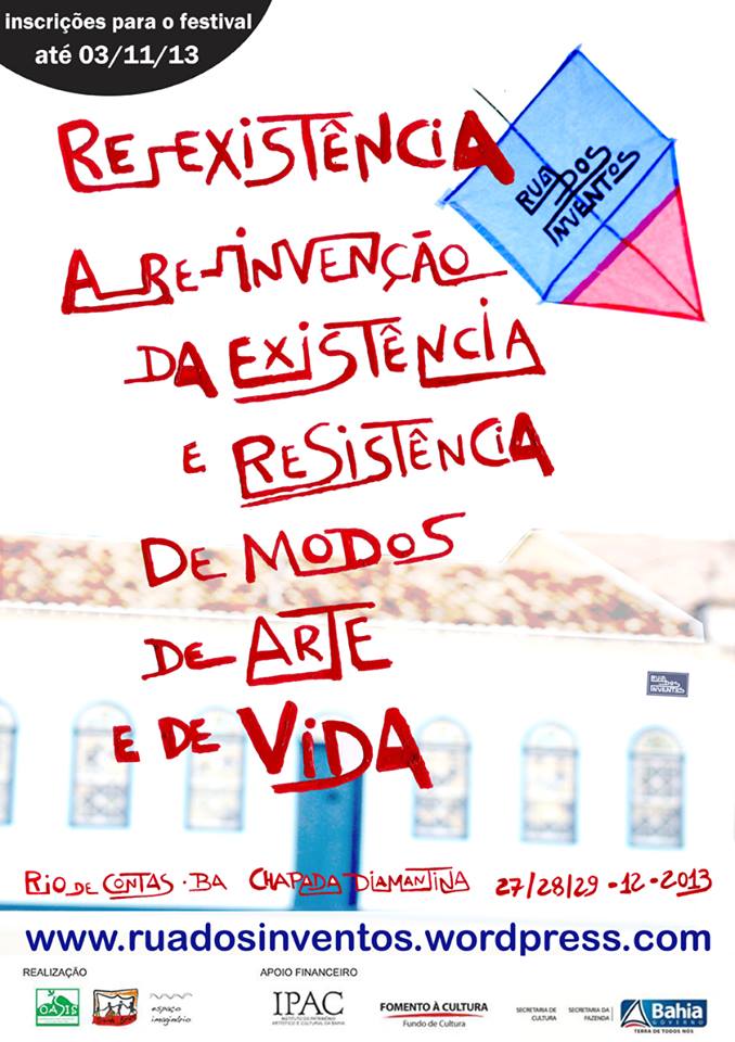Rua dos Inventos é um festival multilinguagens que acontecerá nos dias 27, 28 e 29 de dezembro de 2013 no centro histórico da cidade de Rio de Contas, localizada ao sul da Chapada Diamantina, BA. A idéia é realizar ocupações artísticas nos espaços públicos da cidade a partir de propostas inscritas por meio de seleção pública que se relacionem com o tema desse ano: “Re-existência, a re-invenção da existência de modos de arte e de vida”.