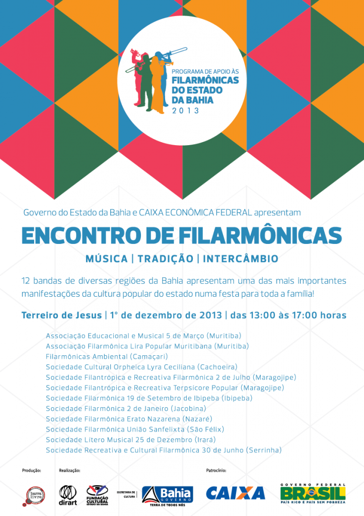 No próximo dia 1º de dezembro (domingo), das 13 às 17 horas, o Terreiro de Jesus, no Pelourinho, será o palco do Encontro de Filarmônicas, evento que trará à capital baiana 12 bandas filarmônicas de diversos locais do estado. O encontro é mais uma das ações para a segunda fase do Programa de Apoio às Filarmônicas do Estado da Bahia em 2013, uma iniciativa da Fundação Cultural do Estado da Bahia (FUNCEB), entidade vinculada à Secretaria de Cultura do Governo do Estado da Bahia (SecultBA), que conta com patrocínio exclusivo da CAIXA Econômica Federal. O Encontro de Filarmônicas é um importante momento de intercâmbio entre as bandas, tendo como alguns de seus objetivos a promoção e a divulgação das filarmônicas da Bahia, além de ser uma atividade de lazer e entretenimento aberta ao público e direcionada a pessoas de todas as idades, promovendo uma das mais relevantes manifestações da cultura popular baiana. As filarmônicas estão presentes nas principais festividades e eventos cívicos municipais, abrilhantando estes momentos com suas marchas e dobrados, além de serem instituições responsáveis por promover o ensino do saber e fazer musical, e, neste sentido, responsáveis em grande medida pela preservação da memória musical do nosso estado. Filarmônicas presentes: Associação Educacional e Musical 5 de Março (Muritiba) Associação Filarmônica Lira Popular Muritibana (Muritiba) Filarmônicas Ambiental (Camaçari) Sociedade Cultural Orpheica Lyra Ceciliana (Cachoeira) Sociedade Filantrópica e Recreativa Filarmônica 2 de Julho (Maragojipe) Sociedade Filantrópica e Recreativa Terpsícore Popular (Maragojipe) Sociedade Filarmônica 19 de Setembro de Ibipeba (Ibipeba) Sociedade Filarmônica 2 de Janeiro (Jacobina) Sociedade Filarmônica Erato Nazarena (Nazaré) Sociedade Filarmônica União Sanfelixta (São Félix) Sociedade Lítero Musical 25 de Dezembro (Irará) Sociedade Recreativa e Cultural Filarmônica 30 de Junho (Serrinha) Programa de Apoio as Filarmônicas do Estado da Bahia: Lançado em 2009, o Programa de Apoio às Filarmônicas do Estado da Bahia objetiva incentivar e valorizar a importante tradição musical das filarmônicas do estado. Em sua primeira etapa, a iniciativa mapeou 183 filarmônicas localizadas em todos os territórios de identidade baianos, sediadas em 170 municípios, e concedeu apoio para 87 delas, distribuindo R$ 4 milhões para aquisição de 1.262 instrumentos musicais e mais de 6 mil acessórios, fardamentos e equipamentos de informática, além de conserto em mais de 500 instrumentos, obtendo impacto direto sobre 74 escolas de música, 4.219 alunos e 2.440 músicos de toda a Bahia. Nesta nova etapa, contribuindo para o suprimento das demandas materiais das bandas e da qualificação técnico-profissional dos seus gestores e músicos, o Programa amplia suas ações. Mais 30 filarmônicas serão diretamente apoiadas com até R$ 30 mil para que se equipem com instrumentos e demais aparatos técnicos, e as bandas cadastradas serão beneficiadas com ações de formação e difusão. A continuidade do projeto se possibilitou com o patrocínio exclusivo da CAIXA Econômica Federal, que disponibilizou um total de R$ 1,5 milhão, garantindo os recursos necessários para o ano de 2013. Encontro de Filarmônicas Onde: Terreiro de Jesus, Pelourinho (Salvador/BA) Data: 1º de dezembro de 2013 (domingo), 13 às 17 horas Quanto: Gratuito Informações: www.fundacaocultural.ba.gov.br/filarmonicas (71) 3324-8524 | musica.funceb@funceb.ba.gov.br Produção: Barra Livre – André PerrottaBinnios e Marcela da Costa Realização: FUNCEB/ SecultBA/ Governo da Bahia Patrocínio: CAIXA Econômica Federal/ Governo do Brasil