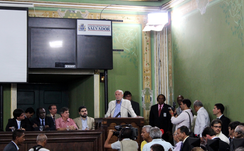 O secretário de Cultura do Estado da Bahia, Albino Rubim, esteve presente nesta segunda (6), no Plenário Cosme de Farias, durante a  solenidade de sanção de um conjunto de leis que regulamentam a política cultural do município de Salvador. Um dos projetos sancionados pelo prefeito de Salvador, ACM Neto, e o presidente da Câmara Municipal de Salvador, Paulo Câmara, foi o que cria o Sistema Municipal de Cultura (PL 567/2013). O evento contou com a participação de autoridades, produtores culturais e artistas da capital baiana. "Pela sua história, memória, patrimônio e importância cultural para o país e para o mundo, a cidade de Salvador não poderia ficar de fora do que vem acontecendo nas políticas culturais desde a gestão do ministro Gilberto Gil. Com a implementação do seu Sistema de Cultura e da Lei de proteção e preservação de patrimônio histórico e cultural da cidade, ela se integra à dinâmica nacional e estadual", afirmou o secretário durante a solenidade. A Lei de proteção e preservação de patrimônio histórico e cultural da cidade, também sancionada na ocasião, permite que o próprio município realize tombamentos de sítios históricos, assim como fazem a Unesco, o Instituto do Patrimônio Histórico e Artístico Nacional (Iphan) e o Instituto do Patrimônio Cultural da Bahia (Ipac), unidade vinculada da  Secretaria de Cultura do Estado da Bahia. Os desafios somam-se às possibilidades para as políticas culturais depois desse momento histórico para a capital baiana: "Agora será possível, por exemplo, definir atribuições específicas para o poderes públicos municipal, estadual e federal no setor da Cultura, otimizando as suas ações ", explicou Rubim. A sanção das leis é resultado de um amplo debate realizado entre o governo e a sociedade, com a realização de três audiências públicas em 2013. Os vereadores apresentaram um total de 25 emendas, sendo todas elas acatadas. "Foi um processo  democrático e mostrou que a cultura é uma pauta apartidária", defendeu o presidente da Fundação Gregório de Mattos, Fernando Guerreiro, que participou ativamente da proposta do Sistema de Cultura. Sistema Estadual de Cultura A implantação do Sistema Estadual de Cultura (SEC) é uma das principais diretrizes da atual gestão estadual no campo da cultura. O objetivo é fortalecer a institucionalização e o relacionamento sistêmico das instituições públicas de cultura da Bahia. O Sistema constitui-se de um processo de articulação, gestão e promoção conjunta de políticas, pactuadas entre os entes da federação – governos federal, estadual e municipal – e a sociedade civil. Atualmente, todos os elementos necessários para o SEC já estão definidos. O Plano Estadual de Cultura já foi aprovado pelo Conselho Estadual de Cultura e aguarda aprovação da Assembleia Legislativa. Além disso, a SecultBA trabalha com o objetivo de motivar os municípios baianos a estruturarem seus sistemas.