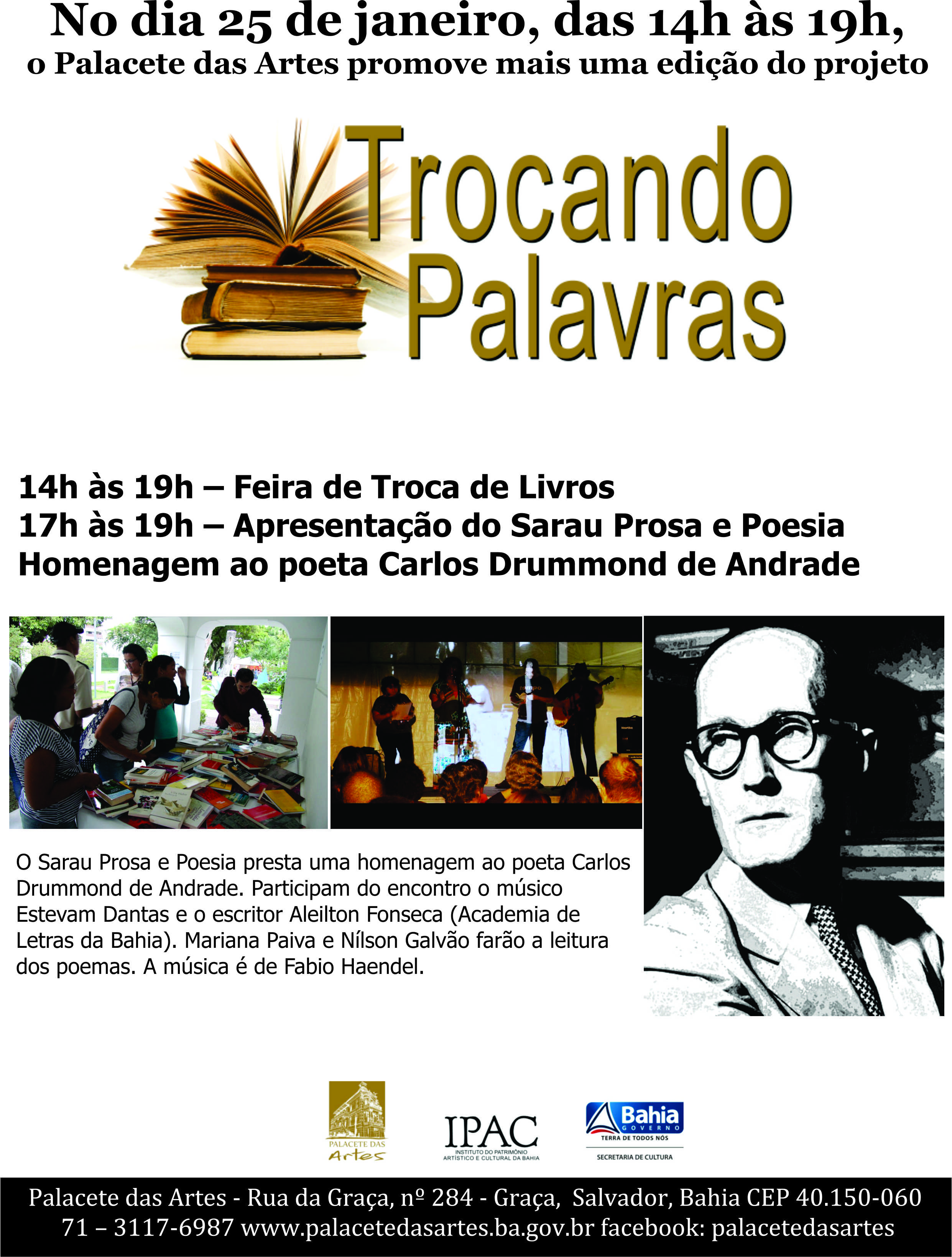 Neste sábado (25 de janeiro), das 14h às 19h, o Palacete das Artes promove mais uma edição do projeto Trocando Palavras. No encontro, o público terá a oportunidade de trocar suas obras literárias, além de doar publicações para a mesma iniciativa. Das 17h às 19h, haverá a apresentação do Sarau Prosa e Poesia, que prestará uma homenagem ao poeta Carlos Drummond de Andrade. Participam da iniciativa o músico Estevam Dantas e o escritor Aleilton Fonseca (Academia de Letras da Bahia). Mariana Paiva e Nílson Galvão farão a leitura dos poemas. A música é de Fabio Haendel.
