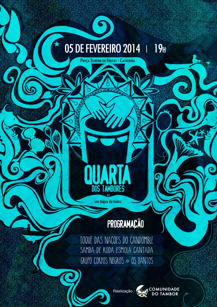 A Quarta dos Tambores chega a sua 28ª edição em fevereiro, saudando a rainha do mar Iemanjá e debatendo a relação do negro com o carnaval. Completa a programação o grupo de samba de roda Esmola Cantada da Ladeira da Cadeia (Cachoeira), o Filho dos Bantos (Vale do Iguape/Cachoeira) e o percussivo Corpus Negro (São Félix). O encontro acontece no dia 5 de fevereiro de 2014 na Praça Teixeira de Freitas, Cachoeira a partir das 19 horas, com homenagens a Mãe Filhinha de Iemanjá. O projeto é um encontro cultural, político e de resistência negra realizado pela Comunidade do Tambor, no Centro Histórico da Cachoeira. E se divide em três momentos: o Toque das Nações, um Debate e o Toque dos Artistas. Nesta edição, a Quarta convida o presidente do Ilê Aiyê, Antônio Carlos dos Santos Vovô e o professor da UFBA, Fernando Conceição, para o debate “O Negro e o Carnaval: Uma faca de dois legumes”. No momento do Toque das Nações uma saudação especial a Iemanjá será realizada. Em homenagem a Narcisa Cândido da Conceição – a Mãe Filhinha de Iemanjá, como era conhecida a mais antiga integrante da Irmandade da Boa Morte. A Yalorixá do terreiro Ilê Axé Itaylê localizado na Baixa da Olaria, Cachoeira, faleceu no dia 18 de janeiro de 2014 aos 110 anos. Filha de Iemanjá Ogunté, Mãe Filhinha integrava há mais de 70 anos a Irmandade da Boa Morte, onde assumiu a condição de Juíza Perpétua e Madre Arcal das mulheres da confraria. As homenagens ficam a cargo de Marcelino Gomes e pai Benício Souza, babalorixás e integrantes da Comunidade do Tambor. No Toque dos Artistas quem se apresenta é o Samba de Roda Esmola Cantada da Ladeira da Cadeia. Conhecido pelas cantigas sobre sua história, transformações do bairro e da cidade, ritos e festas da religiosidade popular, o grupo cachoeirense foi criado há 50 anos a partir da devoção à Santa Cruz instalada na Ladeira da Cadeia. Logo em seguida o grupo sanfelista de percussão Corpus Negro apresenta o seu samba-reggae carregado de influências do Recôncavo. E para encerrar, O Filho dos Bantos – grupo cultural da Comunidade Quilombola de Santiago do Iguape (Cachoeira) – faz um resgate dos aspectos históricos e culturais dos povos Bantos com ritmos Ijexá e Angolano. Programação 28ª edição da Quarta dos Tambores 19:30 – Toque das Nações: homenagens a Mãe Filhinha de Iemanjá 20:00 – Debate: “O Negro e o Carnaval: Uma faca de dois legumes” 20:30 – Samba de Roda Esmola Cantada 21:00 – Grupo de Percussão Corpus Negro 21:30 – Debate: “O Negro e o Carnaval: Uma faca de dois legumes” 22:00 – Filho dos Bantos 22:30 – Encerramento Quarta dos Tambores homenageia Mãe Filhinha de Iemanjá em fevereiro Comunidade do Tambor Onde: Praça Teixeira de Freitas (Cachoeira/BA) Quando: 5 de fevereiro de 2014 (quarta-feira), às 19 horas Quanto: Gratuito Informações:|http://quartadostambores.wordpress.com/ Realização: Comunidade do Tambor/Casa de Cultura Dias Adorno