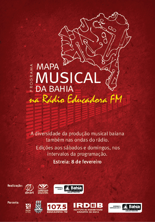 Estreia no dia 8 de fevereiro, na Rádio Educadora FM Bahia (107,5), o programa Mapa Musical da Bahia, que apresentará a obra de artistas integrados ao projeto homônimo, promovido pela Fundação Cultural do Estado da Bahia (FUNCEB), entidade vinculada à Secretaria de Cultura do Estado (SecultBA). Com duração de até cinco minutos, oprograma será veiculado aos sábados e domingos nos intervalos da programação da rádio, destacando um artista a cada edição. Antes do lançamento, o Especial das Seisdo dia 4 de fevereiro (terça-feira), às 18 horas, será focado no assunto, explicando a iniciativa e tocando canções de talentos do estado. Esta inserção radiofônica é realizada em parceria com a Educadora FM, do Instituto de Radiodifusão Educativa da Bahia (IRDEB), e com o Laboratório de Rádio da Faculdade de Comunicação da Universidade Federal da Bahia (FACOM/UFBA). Além de sintonizar o 107,5 FM, o ouvinte pode acompanhar os programas no site www.educadora.ba.gov.br.