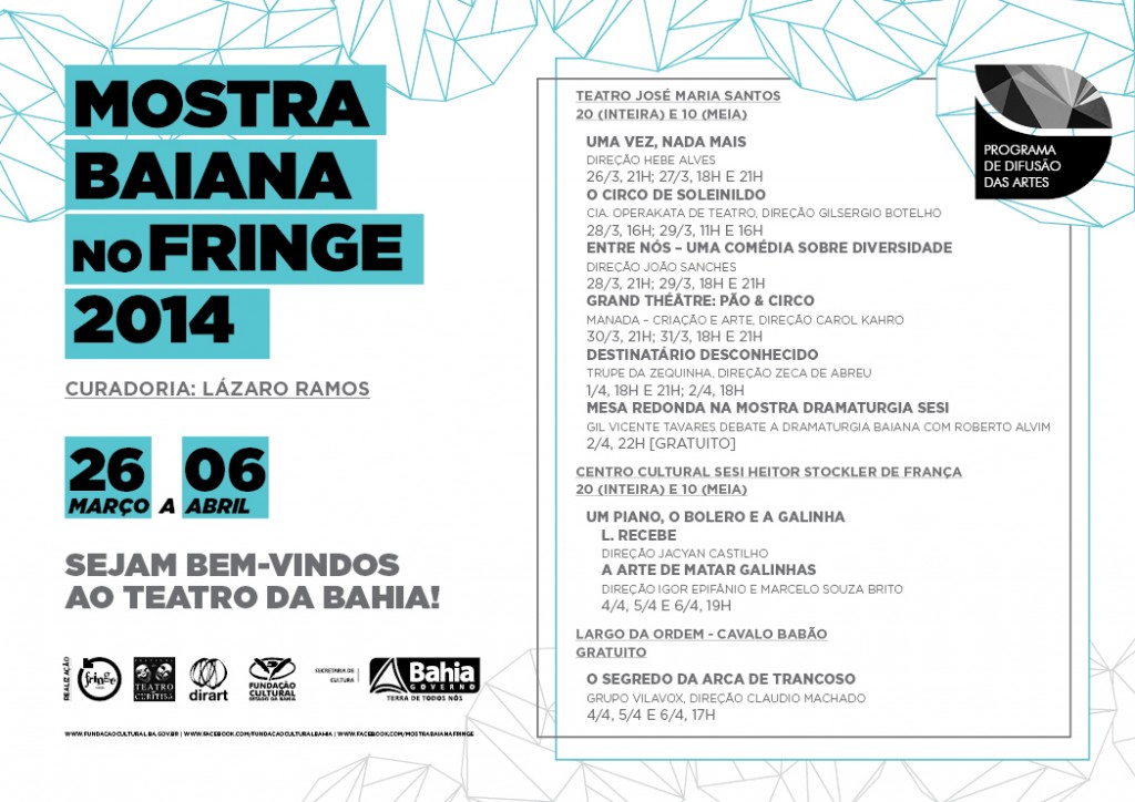Pelo segundo ano consecutivo, o Festival de Teatro de Curitiba terá em sua programação uma Mostra Baiana, desta vez com curadoria do ator Lázaro Ramos. Durante 12 dias, de 26 de março a 6 de abril, sete espetáculos da Bahia ocupam o Teatro José Maria Santos, o Centro Cultural Sesi Heitor Stockler de França e o Largo da Ordem, ampliando a presença baiana na capital paranaense. Destinatário Desconhecido (Trupe do Zequinha, direção Zeca de Abreu),Entre Nós – Uma Comédia sobre Diversidade (direção João Sanches), Grand Théâtre: Pão & Circo (MANADA – Criação e Arte, direção Carol Kahro), O Circo de Soleinildo (Cia. Operakata de Teatro, direção Gilsergio Botelho), O Segredo da Arca de Trancoso (Grupo Vilavox, direção Claudio Machado), Um Piano, O Bolero e A Galinha – projeto que apresentará dois espetáculos-solos: A Arte de Matar Galinhas (direção Igor Epifânio e Marcelo Souza Brito) e L. Recebe(direção Jacyan Castilho) – e Uma Vez, Nada Mais (direção Hebe Alves) vão representar o estado nesta ação que fará parte do FRINGE, mostra paralela do evento. A iniciativa é uma correalização do Festival de Curitiba com a Fundação Cultural do Estado da Bahia (FUNCEB), entidade vinculada à Secretaria de Cultura do Governo do Estado da Bahia (SecultBA), como parte do Programa de Difusão das Artes da Bahia. O objetivo é de promover a recente produção teatral baiana, estimular o seu intercâmbio e apresentar um panorama deste cenário com encenações de qualidade técnica e artística. Lázaro Ramos, reconhecido ator baiano de teatro, cinema e televisão, assina a seleção dos participantes da Mostra Baiana com a colaboração do também ator baiano Marcelo Flores, na perspectiva de apresentar diversas tendências da produção teatral do estado. Os espetáculos foram escolhidos a partir da 2ª edição do Kit Difusão do Teatro da Bahia, que reúne informações sobre 30 montagens teatrais no intuito de ampliar a visibilidade delas nacional e internacionalmente. Assim como ocorreu com a 1ª edição, o material, que apresenta textos trilíngues (português, inglês e espanhol), imagens e vídeos, será lançado na abertura da Mostra Baiana no FRINGE, onde curadores, produtores, artistas, representantes de diversos festivais de artes cênicas e imprensa especializada estarão presentes. Sobre o Kit Difusão do Teatro da Bahia – A 2ª edição do Kit Difusão do Teatro da Bahia foi composta através de uma convocação pública, que contabilizou 46 espetáculos inscritos, de temáticas e formatos diversos, que estiveram em cartaz entre os anos de 2011 e 2013 e que permanecem em atividade. Os trabalhos que se candidataram foram avaliados por três curadores: Maria Marighella, atriz e coordenadora de Teatro da FUNCEB; Jorge Vermelho, ator, diretor, produtor, atual curador artístico do Balé Teatro Castro Alves (BTCA), foi diretor geral do Festival Internacional de Teatro de São José do Rio Preto (2001 a 2009) e do Janeiro Brasileiro da Comédia (2003 a 2009); e Luiz Bertipaglia, jornalista, ator, diretor e produtor de teatro, desde 2003 é diretor artístico e geral do Festival Internacional de Londrina (FILO); também é um dos representantes do Núcleo dos Festivais Internacionais de Artes Cênicas do Brasil. A seleção se baseou na qualidade artística, trajetória dos artistas envolvidos, qualidade do material apresentado e na contribuição para o produto final, cujo princípio é revelar a diversidade de expressões do campo teatral da Bahia. Sobre a 1ª edição da Mostra Baiana no FRINGE – Em 2013, a estreia da Mostra Baiana no FRINGE se deu com a curadoria do ator Wagner Moura, com colaboração de Vadinha Moura, reunindo os espetáculos Áfricas (Bando de Teatro Olodum, direção Chica Carelli), Luz Negra (Rino Carvalho), O Pássaro do Sol(Grupo A RODA, direção Olga Gómez), Pólvora e Poesia (Fernando Guerreiro), Sargento Getúlio (Teatro NU, direção Gil Vicente Tavares), Seu Bomfim (Grupo O Território Sirius Teatro, direção Fábio Vidal e Meran Vargens) e Siré Obá – A Festa do Rei (Núcleo Afrobrasileiro de Teatro de Alagoinhas, direção Fernanda Júlia). Mostra Baiana no FRINGE do Festival de Teatro de Curitiba 2014 Curadoria: Lázaro Ramos
