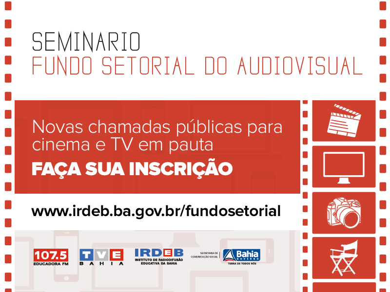 A Agência Nacional do Cinema (ANCINE) realiza em Salvador, no próximo dia 21.03, com inscrições gratuitas (até 19/03), o Seminário Fundo Setorial do Audiovisual, no auditório do Instituto de Radiodifusão Educativa da Bahia (IRDEB). O evento, realizado em parceria com a SECOM – Secretaria de Comunicação do Estado, através do IRDEB, com a Secult – Secretaria de Cultura, o Conselho de Comunicação do Estado, o Instituto Gota e a Associação de Produtores e Cineastas da Bahia (APC-BA) acontece das 10h às 17h, e é voltado para produtores registrados na ANCINE, profissionais de empresas produtoras, distribuidoras ou programadoras de conteúdo audiovisual, responsáveis pela execução dos projetos financiados pelo Fundo, gestores de fundos de investimento com participação do Fundo Setorial do Audiovisual - FSA, entre outros. Na pauta, estão as novas chamadas públicas do Fundo para produção e comercialização de projetos para cinema e TV.