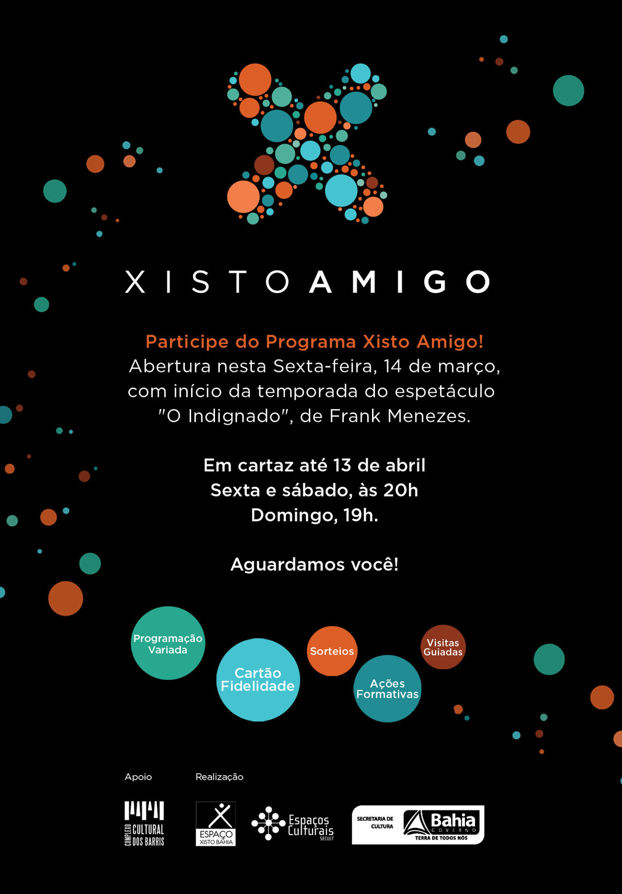 Em março os soteropolitanos vão ganhar mais um motivo para frequentar o Espaço Xisto Bahia. Trata-se do Xisto Amigo, um programa de mobilização voltado para o estímulo do consumo cultural, neste que é um dos mais tradicionais centros de difusão das artes em Salvador. Surgido da necessidade de se criar um público fiel à sua programação, o Xisto Amigo envolve um conjunto de ações de difusão, promoção e valorização dos espetáculos artísticos bem como de seu público.