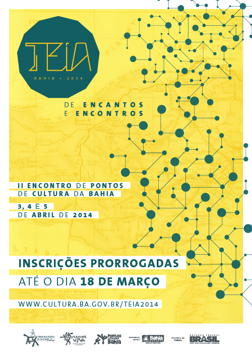 A Secretaria de Cultura do Estado da Bahia (SecultBA), através da Diretoria de Cidadania Cultural, informa que estão prorrogadas até 18/03(terça - feira), as inscrições para o II Encontro da rede de Pontos de Cultura da Bahia, evento que acontecerá de 03 a 05 de abril de 2014, no Centro Histórico, em Salvador. As inscrições continuam sendo feitas site da TEIA Bahia 2014. A TEIA Bahia é um evento realizado pela Secretaria de Cultura da Bahia - SecultBA em parceria com a Comissão Estadual dos Pontos de Cultura (CEPdC) tendo como objetivo fortalecer o Programa Cultura Viva na Bahia através da articulação e do intercâmbio de experiências entre os Pontos de Cultura do estado. Não perca mais essa chance e garanta seu espaço! Inscrições pelo hotsite:http://www.cultura.ba.gov.br/teia2014