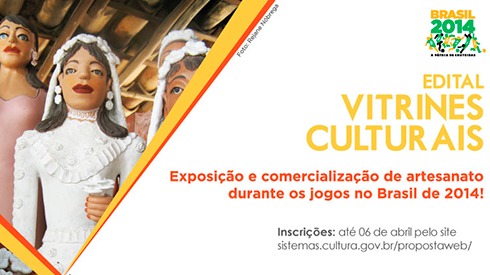O Edital Vitrines Culturais promoverá exposição e comercialização, entre 12 de junho e 13 de julho de 2014, de artesanato das diversas regiões do Brasil. Nesta quinta-feira (20/03), a Representação Regional MinC Bahia e Sergipe realiza uma oficina voltada aos artesãos da região metropolitana de Salvador, em parceria com a Secretaria Municipal da Reparação (Semur), no Centro de Cultura da Câmara de Vereadores, Praça Municipal, às 9 horas. A previsão é mobilizar 300 artesãos. O edital promoverá exposição e venda de artesanato brasileiro durante a Copa, apresentando ao mundo a rica diversidade do artesanato dos 27 estados do país. As exposições acontecerão nas Fifa Fan Fest e espaços culturais das cidades-sede dos jogos, com ênfase em Salvador, Belo Horizonte, Manaus, Recife, Rio de Janeiro, São Paulo e Porto Alegre. O edital fica aberto até 6 de abril e pode selecionar até 60.000 peças artesanais, de valor simbólico e estético, que expressem valores culturais brasileiros. A mudança no edital que permitiu a inscrição pelos Correios é uma forma de garantir a acessibilidade de artesãos que vivem em regiões mais remotas ou tem dificuldade de acesso à internet. Podem participar artesãos brasileiros de qualquer parte do país, de forma individual ou por meio de grupos produtivos, núcleos, associações ou cooperativas de artesãos. O projeto Vitrines Culturais é coordenado pela Secretaria da Economia Criativa do MinC, em parceria com a Secretaria da Micro e Pequena Empresa, vinculada à Presidência da República. Foi lançado no dia 21/02, pelo Ministério da Cultura e a Secretaria da Micro e Pequena Empresa da Presidência da República. Também participam do projeto o Sebrae, o IPHAN e o Ministério do Desenvolvimento Agrário, por meio do projeto Talentos do Brasil Rural Contemporâneo. Serviço: Oficina Edital Vitrines Culturais Data e horário: quinta-feira; 20/03, às 9h Local: Centro de Cultura da Câmara de Vereadores, Praça Municipal Projeto Vitrines Culturais Data: 12 de junho a 13 de julho de 2014 Inscrições até 06 de abril pelos correios e pela internet: sistemas.cultura.gov.br/propostaweb Informações: vitrinesculturais2014@cultura.gov.br