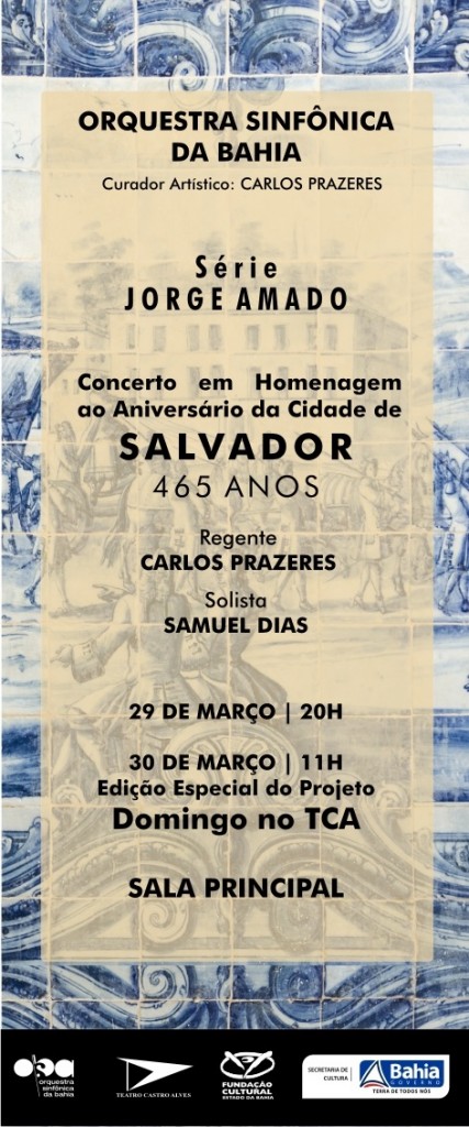 O Complexo Teatro Castro Alves, em conjunto com a Fundação Cultural do Estado da Bahia (Funceb), entidade vinculada à Secretaria de Cultura do Governo do Estado  da Bahia (SECULT-BA), vem a público informar que a edição do projeto Domingo no TCA confirmada  para o próximo dia 30 de março (domingo), às 11h, na Sala Principal do TCA, oferecerá uma nova programação artística. Ao invés de realizar o BAILECONCERTO, a Orquestra Sinfônica da Bahia (OSBA) aproveitará a ocasião para promover um concerto em celebração aos 465 anos de Salvador, que serão completados na véspera, em 29 de março. Aproveitamos para lembrar que, apesar da mudança, a OSBA mantém o seu compromisso do dia 29 de março – dia do aniversário da capital baiana – às 20h, na Sala Principal do TCA, com o mesmo programa que será apresentado no dia seguinte pelo Domingo no TCA. A regência dos dois concertos será do maestro Carlos Prazeres, atual curador artístico da OSBA. Os ingressos para  sábado (29) estão à venda por R$ 20 (inteira)R$ 10 (meia). Já as entradas para o Domingo no TCA, como de costume, custam R$ 1 e serão vendidas somente no dia do espetáculo, a partir das 9h, com acesso imediato do público.