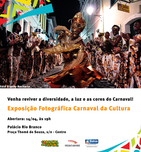 O brilho e a tradição dos blocos afros, a animação e a diversidade de ritmos do Pelourinho, passando pela criatividade dos microtrios. A Secretaria de Cultura do Estado da Bahia (SecultBA) abre nesta segunda-feira, 14 de abril, às 19 horas, no Palácio Rio Branco, a exposição Carnaval da Cultura. A mostra reúne 40 fotografias registradas durante a festa nos programas Carnaval do Pelô, Outro Negro, Pipoca e Outros Carnavais. As imagens foram feitas pelos fotógrafos Álvaro Vilella, Edson Ruiz, Lucia Correia Lima, Rosilda Cruz e Sidney Rocha. A exposição, que tem entrada gratuita, poderá ser visitada até 27 de abril. “As fotos registram em imagens a multiplicidade de alegrias, criatividades, estilos, imaginários, modalidades e personagens que animam nosso carnaval. A documentação destes carnavais tem sido trabalho da SecultBA. Nossos fotógrafos produziram expressivas imagens do Carnaval da Cultura. Nada melhor que selecionar algumas delas e colocá-las à disposição dos olhares do público, carnavalesco ou não”, afirma o secretário estadual de cultura da Bahia, Albino Rubim. As imagens da festa em Salvador foram registradas no Carnaval 2014 nos largos e praças do Pelourinho – que homenageou, este ano, os 40 anos do Ilê Aiyê e o centenário de Dorival Caymmi, nos desfiles do Ouro Negro – que incluem os blocos afros, de índio, de samba e afoxés, e no Carnaval Pipoca, com a criatividade e a alegria dos microtrios. Já as fotografias da festa em Maragojipe – que integra, ao lado do Palco do Rock, em Piatã, o projeto Outros Carnavais da Secult – foram feitas entre 2006 e 2012. A curadoria das imagens foi feita pelos fotógrafos Adenor Gondim e Célia Aguiar, pela jornalista Adriana Jacob, assessora de comunicação da SecultBA e pela produtora cultural Cristiane Taquari, coordenadora do Centro de Culturas Populares e Identitárias da SecultBA. A exposição Carnaval da Cultura fica em cartaz no Palácio Rio Branco, de terça a sexta-feira, das 10h às 18h e aos sábados de domingos, das 10h às 14h. De Salvador, a mostra segue para o interior do estado, onde deve circular pelos espaços culturais administrados pela SecultBA. Carnaval da Cultura: Tendo como marca a diversidade, o Carnaval da Cultura reuniu uma mistura de ritmos e gêneros musicais e, principalmente, a estética e a arte de milhares de artistas. Com investimento do Governo do Estado em torno de R$ 10 milhões, possibilitou o acesso gratuito dos foliões a 218 atrações, que foram selecionadas para receber o apoio da Secretaria de Cultura do Estado da Bahia, considerando a qualidade e mérito das propostas, avaliadas por uma curadoria formada por profissionais altamente qualificados e de competência técnica. Exposição Carnaval da Cultura Fotógrafos: Álvaro Vilella, Edson Ruiz, Lucia Correia Lima, Rosilda Cruz e Sidney Rocha. Curadoria: Adenor Gondim, Adriana Jacob, Célia Aguiar e Cristiane Taquari. Coordenação Expográfica: Cristiano Cardoso Onde: Palácio Rio Branco – Praça Thomé de Souza, S/N- Centro. Abertura: 14/04, às 19h. Quando: De 14 a 27/04. De terça a sexta-feira, das 10h às 18h. Sábados e domingos, das 10h às 14h. Entrada Gratuita.