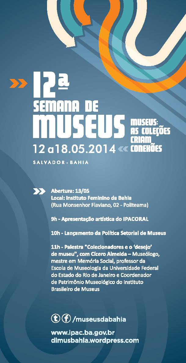A 12ª Semana de Museus, uma realização do Instituto Brasileiro de Museus (Ibram/MinC) articulada na Bahia pela Diretoria de Museus do Instituto do Patrimônio Artístico e Cultural da Bahia (DIMUS/IPAC), já tem sua programação definida e acontecerá entre os dias 12 a 18 de maio de 2014. Para o evento – nacional – as instituições museológicas promovem ações voltadas para uma temática específica que, nesta edição, será: “Museus: as coleções criam conexões".