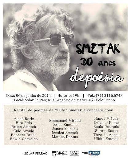 Em homenagem aos 30 anos de morte de Anton Walter Smetak, será realizado na sexta-feira (06/06), às 19h, no Solar Ferrão (Pelourinho) um concerto com recital de poesias de autoria do músico. As réplicas de Smetak serão tocadas por artistas – alguns que  inclusive foram alunos do músico ou que receberam a influência da sua produção. A iniciativa é da família com o apoio do Solar Ferrão, onde estão expostas as “As Plásticas Sonoras” de Smetak. A mostra apresenta as peças do acervo da família do músico suíço que viveu na Bahia entre 1937 e 1984.