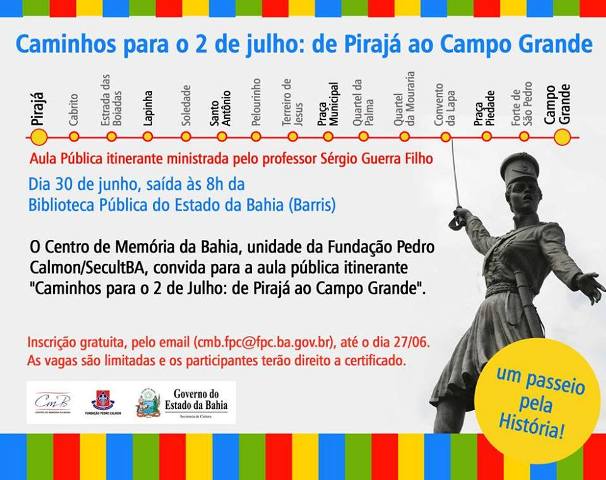 A programação cultural da Fundação Pedro Calmon/SecultBa no 2 de julho começa no dia 30 de junho (segunda-feira), com a aula pública itinerante"Caminhos para o 2 de Julho: de Pirajá ao Campo Grande", que será ministrada pelo professor e historiador, Sergio Guerra Filho em pontos históricos como o Largo do Pirajá, Lapinha, Largo do Santo Antônio, Praça Municipal, Praça da Piedade e Campo Grande. A aula terá como tema as lutas pela emancipação do Brasil ocorridas nestes cinco locais, além dos festejos que envolvem a data magna da Bahia. Para participar, os interessados devem se inscrever até o próximo dia 27/06, exclusivamente por email (cmb.fpc@fpc.ba.gov.br). Organizada pelo Centro de Memória da Bahia, unidade vinculada à Fundação, a aula terá início às 8h, num roteiro que sairá da Biblioteca Pública do Estado (Barris) em direção aos pontos específicos das lutas. Serão oferecidas 60 vagas e os participantes terão direito a certificado. Para a diretora do Centro de Memória, Jacira Primo, percorrer esse locais será uma forma participativa de conhecer a história da Bahia e do Brasil. “Vamos fazer o percurso do festejo do 2 de Julho, que é o caminho por onde passou o Exército Libertador, ao longo do qual o professor falará sobre o processo de luta e a simbologia da data. A intenção é difundir a história e memória da independência de forma interativa”, frisou Primo. Sérgio Guerra Filho é doutorando em História pela Universidade Federal da Bahia (Ufba), professor da Universidade Federal do Recôncavo da Bahia (UFRB) e tem experiência em História Regional do Brasil e Ensino de História, atuando principalmente na temática da independência da Bahia e nas lutas populares. Serviço Aula pública “Caminhos para o 2 de Julho: de Pirajá ao Campo Grande” Quando: Dia 30 de junho, a partir das 8h, com saída da Biblioteca Pública do Estado (Barris). Itinerário: Largo do Pirajá, Lapinha, Largo do Santo Antônio, Praça Municipal, Praça da Piedade e Campo Grande Inscrição gratuita por email (cmb.fpc@fpc.ba.gov.br), até 27/06. Vagas limitadas.
