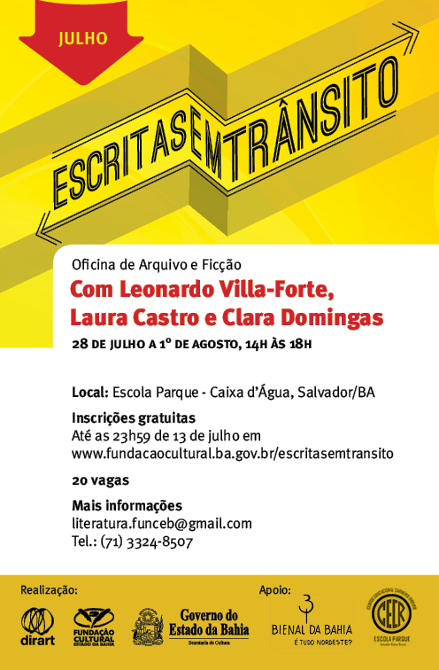 A Fundação Cultural do Estado da Bahia (FUNCEB), entidade vinculada à Secretaria de Cultura do Estado (SecultBA), dá início às turmas de 2014 doEscritas em Trânsito, projeto que promove oficinas gratuitas ministradas por renomados autores da literatura contemporânea de língua portuguesa. Quem abre a programação é o escritor e artista visual Leonardo Villa-Forte (www.leonardovillaforte.com), com a oficina Arquivo e Ficção. A escritora Laura Castro e a artista visual Clara Domingas também participam da oficina, que é parceira da 3ª Bienal da Bahia e compõe o grupo de ações desenvolvidas pelo núcleo Arquivo e Ficção, cujo espaço de ação é o Arquivo Público do Estado da Bahia, sob a curadoria de Ana Pato.