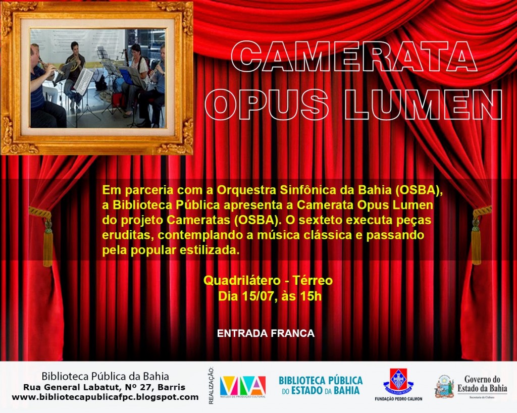 Em parceria com a Orquestra Sinfônica da Bahia (OSBA), a Biblioteca Pública do Estado da Bahia recebe a Camerata Opus Lumen, do projeto Cameratas da OSBA, no dia 15 de julho às 15h no Quadrilátero da Instituição.