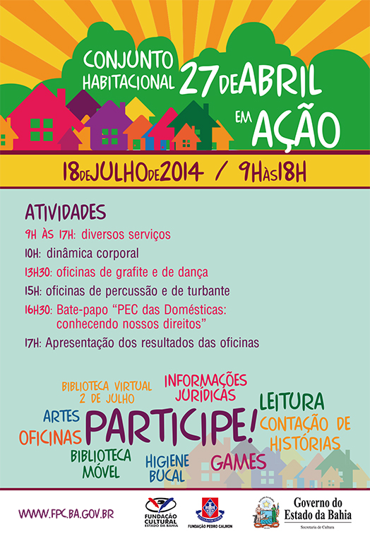 No primeiro conjunto habitacional construído, exclusivamente, para as trabalhadoras domésticas baianas, a Fundação Pedro Calmon/Secretaria de Cultura do Estado da Bahia promoverá o projeto “Conjunto Habitacional 27 de abril em Ação”, nesta sexta-feira (18/07), das 9h30 às 17h. O projeto, em parceria com o SESC e a Defensoria Pública do Estado, levará atividades culturais e leitura ao conjunto, destinadas às domésticas, jovens e crianças, além de diálogos sobre a PEC das Domésticas. Na ocasião, serão realizadas oficinas de dança, grafite, turbante e música, além da presença da Biblioteca Móvel, disponibilizando não somente suas tradicionais estantes recheadas de livros, jornais e revistas de variados gêneros, como também atividades culturais e dinâmicas que ligam o livro ao prazer da leitura. Já a Biblioteca Virtual Dois de Julho, unidade da Fundação, disponibilizará o jogo “Tabuleiro Virtual 2 de Julho”, que testa o conhecimento do público sobre a data histórica baiana. A Diretoria do Livro e Leitura (DLL), unidade da Fundação levará sua tradicional Feira de Livros, com obras a preços acessíveis ao público. Para ampliar o conhecimento das moradoras sobre a Proposta de Emenda à Constituição (PEC 72/13), que garantiu direitos trabalhistas para a categoria, a Fundação levará a Defensoria Pública do Estado para tirar dúvidas das domésticas sobre estes direitos. Haverá também o SESC, com serviços de higiene bucal destinado a todos. Todas as atividades serão gratuitas. Moradia - O Núcleo Habitacional 27 de Abril, no bairro do Doron, inaugurado em 2012, é um empreendimento formado por 80 apartamentos, quadra de esportes e um parque infantil. Tem este nome em alusão ao Dia Nacional da categoria (27/4). No Brasil, segundo levantamento realizado pelo IBGE, existem 7,2 milhões de empregadas domésticas, deste total, 500 mil apenas na Bahia. PROGRAMAÇÃO Sexta-feira, dia 18 de julho, das 9h30 às 17h •Biblioteca Móvel: leitura e artes •Defensoria Pública do Estado da Bahia: informações jurídicas sobre a PEC das Domésticas •SESC: higiene bucal •Biblioteca Móvel ATIVIDADES •14h: Oficina de grafite e dança •16h: Oficina de percussão e turbante 17h: Roda de Conversa “PEC das Domésticas: conhecendo nossos direitos”, com representantes da categoria e da Defensoria Pública do Estado da Bahia.