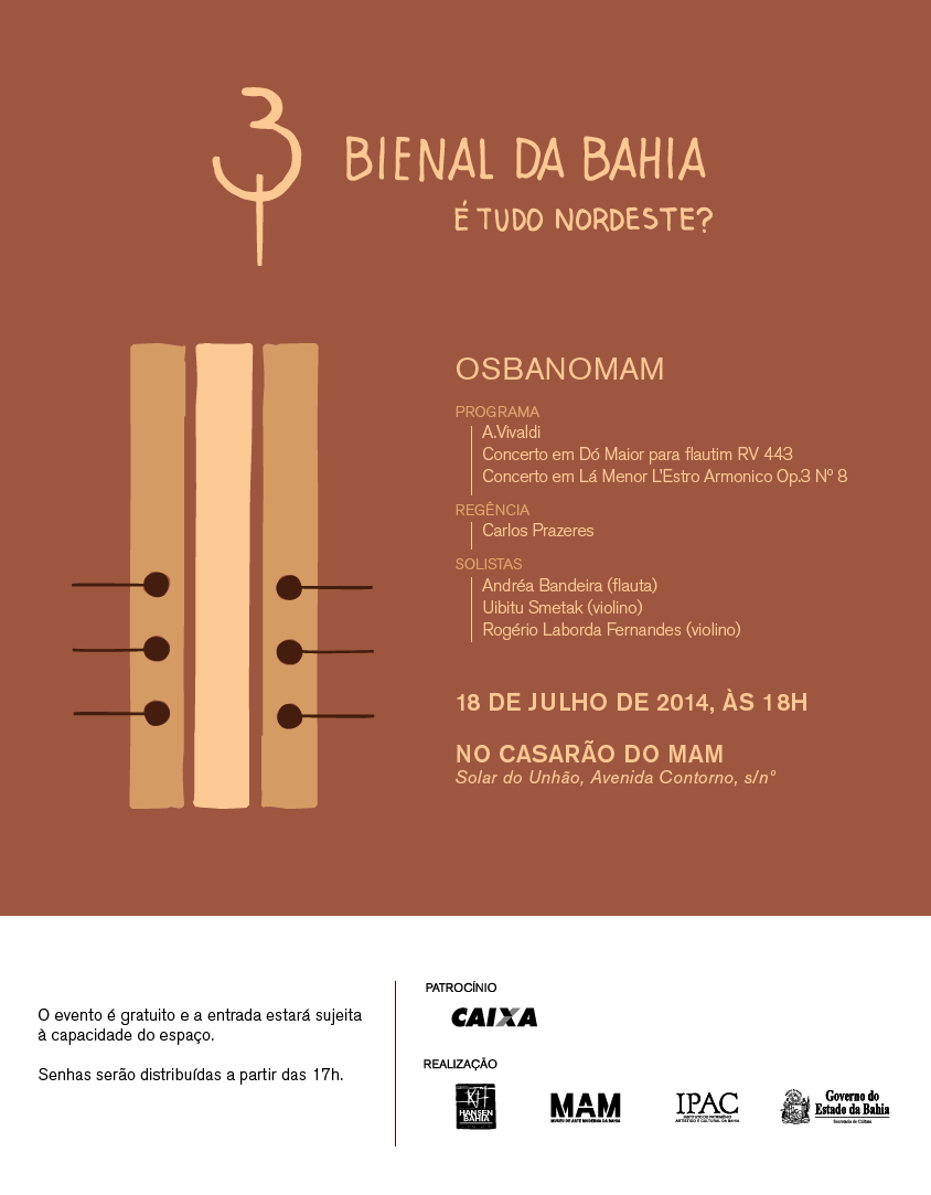 A 3ª Bienal da Bahia, através do Museu de Arte Moderna da Bahia (MAM-BA), realiza mais uma edição do Sarau OSBANOMAM, no Casarão do MAM-BA, nesta sexta-feira, 18 de julho, às 18h . A Orquestra Sinfônica da Bahia, sob regência do maestro Carlos Prazeres, apresentará o programa A Vivaldi. Os solistas da noite serão Andréa Bandeira (flauta), Uibitu Smetak e Rogério Laborda Fernandes (violino).