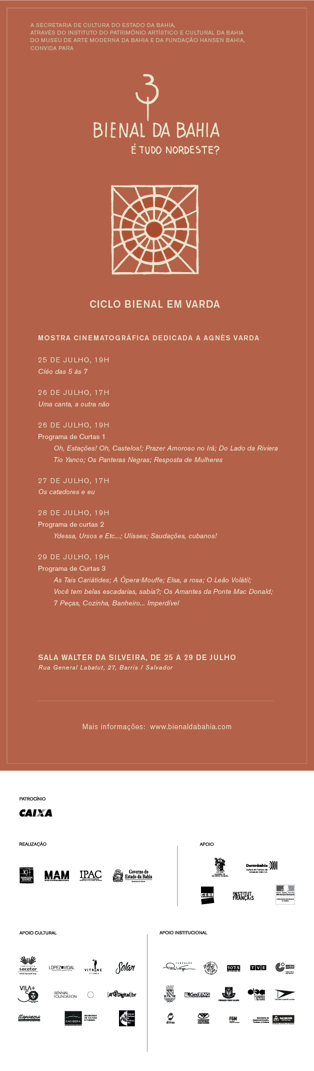 A 3ª Bienal da Bahia apresenta o Ciclo Bienal em Varda, de 25 a 29 de julho, na Sala Walter da Silveira. A cineasta e fotógrafa belga Agnès Varda dirigiu filmes com temáticas relacionadas à realidade no documentário, ao feminismo e ao comentário social. Confira a programação abaixo e as sinopses no site www.bienaldabahia.com