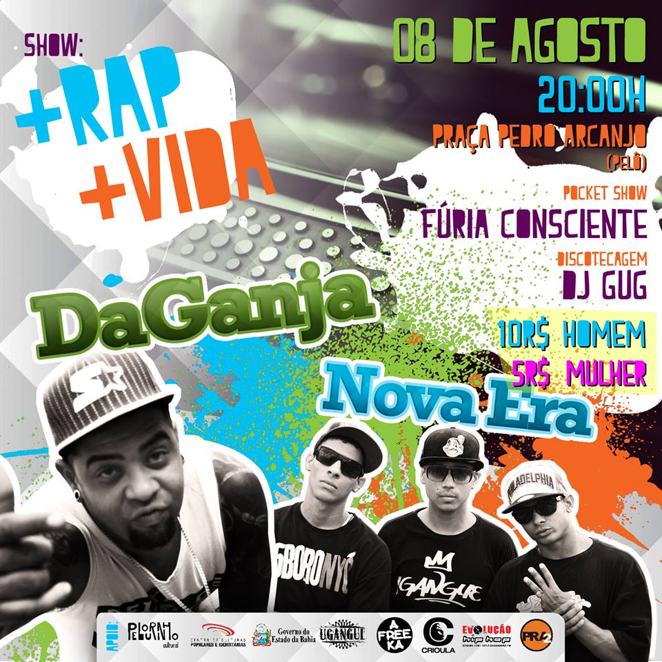 Salvador recebe no dia 08 de agosto, às 20h, a primeira edição do evento “+Rap +Vida”, que reúne no Pelourinho (Largo Pedro Arcanjo) importantes nomes do cenário baiano de rap, como DaGanja, Nova Era e Fúria Consciente. A noite ainda conta com a discotecagem de Dj GuG e a apresentação do Mc Kiko.