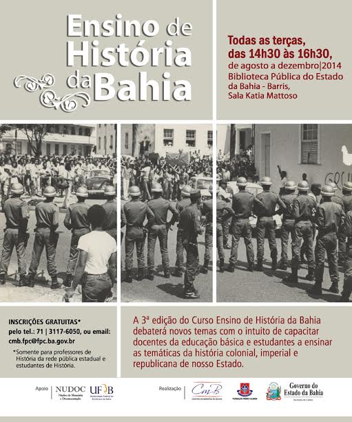 Estão abertas as inscrições para a 3ª edição do curso “Ensino de História da Bahia”, que ocorrerá nas terças-feiras (até dezembro), das 14h30 às 16h30, na sala Kátia Mattoso – Biblioteca Pública do Estado da Bahia (Barris). Em agosto, o tema será “Imagens e fotografias na História”, ministrado pela professora da Universidade Estadual da Bahia (Uneb), Ligia Conceição, nos dias 5, 12 e 8/8. As inscrições são gratuitas e podem ser feitas pelo telefone 3117-6050, ou pelo e-mail: cmb.fpc@fpc.ba.gov.br.