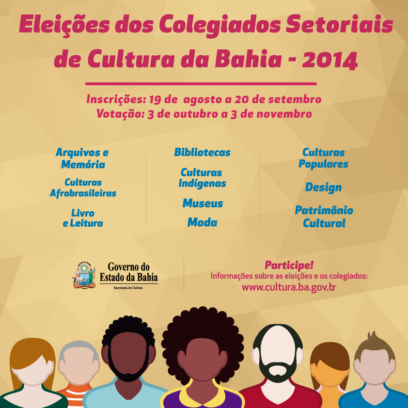 Nesta sexta-feira, dia 15 de agosto, das 9 às 17 horas, na Biblioteca Pública do Estado da Bahia - Barris , será realizada a primeira reunião da comissão organizadora das eleições dos Colegiados Setoriais de Cultura da Bahia. O processo, articulado pela Secretaria de Cultura do Estado da Bahia (SecultBA e unidades vinculadas, vai possibilitar a formação de novos grupos representativos, além dos já formados colegiados das artes, em 2012, que representam cada linguagem artística (Artes Visuais, Audiovisual, Circo, Dança, Literatura, Música e Teatro). Os novos grupos de representação social serão dos setores de Arquivos e Memória, Bibliotecas, Design, Livro e Leitura, Patrimônio Cultural, Museus, Culturas Populares, Culturas Indígenas, Culturas Afrobrasileiras e Moda. Terão atuação no biênio de 2015-2016 assumindo o papel de orientar e respaldar decisões políticas, atuando como instâncias de consulta, participação e controle social das ações promovidas pelo poder público. Os Colegiados Setoriais estão previstos na Lei Orgânica da Cultura da Bahia (Lei nº 12.365 de 22 de novembro de 2011). A sua formação é uma conquista da comunidade artística e de toda a sociedade civil baiana, como um importante passo para o desenvolvimento das políticas culturais do estado. O cadastramento de eleitores e candidatos será iniciado no próximo dia 19, através de plataforma virtual que será disponibilizada no site da SecultBA. Para participar das eleições dos Colegiados Setoriais de Cultura da Bahia, como eleitor ou como candidato, é necessário estar devidamente cadastrado. O resultado das eleições será publicado no Diário Oficial do Estado da Bahia e divulgado pela SecultBA. Os eleitos, titulares e suplentes, serão empossados em ato oficial em data a ser divulgada no site da Secretaria. Reunião da Comissão Organizadora das Eleições dos Colegiados de Cultura da Bahia 1º mandato: 2015-2016 Quando: 15/8/2014, das 9h às 17h. Onde: Biblioteca Pública do Estado da Bahia - Barris