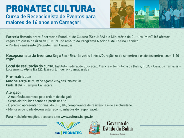 A Secretaria de Cultura do Estado da Bahia oferece 20 vagas para o curso de Recepcionista de Eventos, realizado pelo Instituto Federal de Educação, Ciência e Tecnologia da Bahia (IFBA), no campus de Camaçari. O curso, que tem início marcado para o dia 1º de setembro, integra o Programa Nacional de Ensino Técnico e Profissionalizante (Pronatec), fruto da parceria entre o Ministério da Educação (MEC) e o Ministério da Cultura (MinC). O programa foi criado em 2011 para ampliar a oferta de cursos de educação profissional e tecnológica. Até o fim do ano, o Pronatec oferece diversos cursos gratuitos nas áreas de Cultura e Arte na capital e no interior da Bahia. A pré-matrícula para o curso de Recepcionista será no dia 19 de agosto, no Campus de Camaçari do IFBA. Para ocupar as 20 vagas, os candidatos devem, obrigatoriamente, ter o ensino fundamental completo e a idade mínima de 16 anos. As aulas terão início no dia 1º setembro e vão até 5 de dezembro, com atividades de segunda à sexta, acumulando carga horária de 200 horas no fim do curso. A participação do MinC nas negociações das vagas do Pronatec faz parte das ações de integração de Educação e Cultura em diálogo com um conjunto de metas do Plano Nacional de Cultura (PNC), que prevê um aumento de 150% de vagas para essas áreas. SERVIÇO O que é? Curso de Recepcionista de Eventos (20 vagas; 200h) Período do curso: 01/09 a 05/12 Horário das aulas: segunda à sexta, das 18h30 às 21h30 Local de realização do curso: Loteamento Espaço Alpha Ba, 522, Bairro Limoeiro - Campus Camaçari – IFBA (próximo ao Hospital Geral) Telefones: (71) 3649-8600 Descrição da vaga: recepciona e acolhe pessoas em eventos; conduz, orienta e fornece informações, materiais e equipamentos necessários. Pré-matrícula: Quando: 19/08, das 9h às 12h (atendimento por ordem de chegada; senhas distribuídas a partir das 8h); Onde: Loteamento Espaço Alpha Ba, 522, Bairro Limoeiro - Campus Camaçari – IFBA (próximo ao Hospital Geral); Documentos exigidos: original do CPF, RG, comprovante de residência e de escolaridade. Pré-requisitos: idade mínima de 16 anos, ensino fundamental completo.
