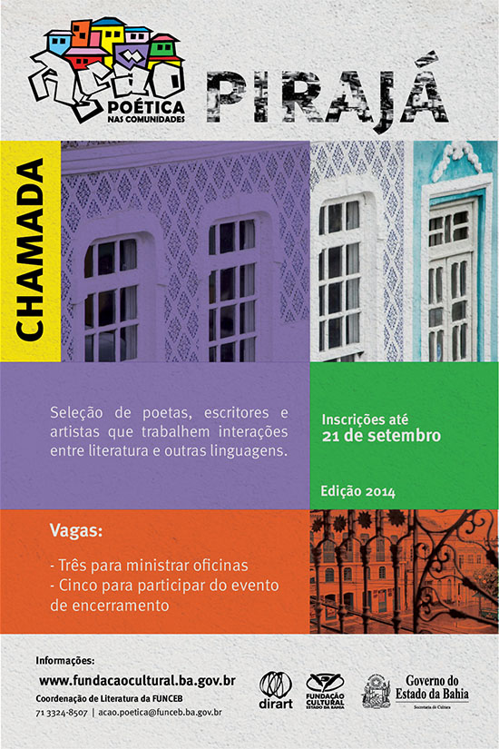 Termina este domingo, 21 de setembro, o prazo estabelecido pela Fundação Cultural do Estado da Bahia (FUNCEB), entidade vinculada à Secretaria de Cultura do Governo do Estado (SecultBA), para inscrição de artistas e grupos no projeto Ação Poética nas Comunidades. Entre os requisitos, os artistas ou grupos devem ser residentes na Bahia, para realizar oficinas e performances no evento, e trabalhar interações entre a literatura e linguagens diversas. Neste ano, o projeto se realizará em Pirajá, bairro de Salvador, no mês de novembro, com sede no Centro de Cultura e Cidadania Pirajá. Criado em 2012 e com edições já realizadas no Solar do Unhão e em Alagados, o Ação Poética nas Comunidades intenciona promover intervenção artística e social por meio da poesia, em sua diversidade de estilos e abordagens, em comunidades populares, através de atividades gratuitas, abertas ao público. Busca contribuir para amenizar carências socioculturais, proporcionando um tempo e um espaço para reflexão, sob o encanto da palavra poética. Cada vez mais assumida como uma arte interdisciplinar e com inúmeras possibilidades de abordagem, a poesia extrapola os espaços canônicos e invade o cotidiano. O projeto vai oferecer três oficinas artísticas com carga horária de 15 a 20 horas e 25 vagas em média cada, ao longo dos cinco primeiros dias, culminando numa intervenção final no sexto e último dia, que vai integrar os oficineiros, alunos e demais artistas e coletivos participantes. Todos os profissionais envolvidos serão contratados através do concurso em andamento. As propostas de oficinas podem ser de temáticas variadas, relacionadas à literatura e sua interação com outras manifestações das artes. Já a ação de encerramento deve reunir artistas da palavra, poetas de diferentes tendências e estéticas – dos canônicos aos alternativos e periféricos –, além de artistas visuais, audiovisuais, circenses, dançarinos, músicos, atores e demais agentes que tragam em suas expressões as potencialidades da literatura. Os três profissionais e/ou grupos que ministrarem aulas receberão um cachê total no valor de R$ 2,2 mil pelas atividades assumidas. Outros cinco artistas e/ou coletivos serão selecionados para se juntar aos primeiros nas ações finais, para fazer apresentações e performances, com remuneração de R$ 1 mil. As despesas de passagem e hospedagem para os que necessitarem viajar serão custeadas pela FUNCEB. Podem participar pessoas físicas, maiores de 18 anos, brasileiros natos ou naturalizados, além de estrangeiros com situação de permanência legalizada, ou pessoas jurídicas do campo artístico-cultural, domiciliadas ou estabelecidas na Bahia. Há três vias pelas quais os candidatos podem enviar os documentos exigidos: presencialmente, na sede da FUNCEB, em Salvador/BA, de segunda a sexta-feira, das 10 às 12 e das 14 às 17 horas; por via postal, através de correspondência registrada ou Sedex, com Aviso de Recebimento; ou através de e-mail, pelo endereço acao.poetica@funceb.ba.gov.br, conforme orientações na minuta. Chamada Pública: Ação Poética 2014 Quando: Até 21 de setembro Quanto: Grátis Informações: 71 3324-8507 / literatura.funceb@funceb.ba.gov.br www.fundacaocultural.ba.gov.br Realização: Dirart/ FUNCEB/ SecultBA