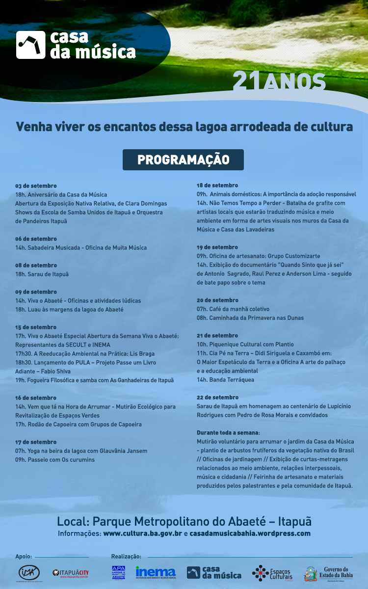 Na data em que completa 21 anos, 3 de setembro, a Casa da Música abre as portas para um show com a Orquestra de Pandeiros Itapuã e a Escola de Samba Unidos de Itapuã, às 18h. Na mesma noite, tem abertura da Exposição Nativa Relativa, de Clara Domingas. A programação em homenagem ao aniversário segue até 22 de setembro com capoeira, yoga, luau e oficinas e atividades lúdicas e ambientais. Localizada no Parque Metropolitano do Abaeté, a Casa da Música – um dos 17 espaços culturais da Secretaria de Cultura do Estado da Bahia (SecultBA) – é considerada referência não apenas para a comunidade de Itapuã, mas para a cidade de Salvador por sua atuação no setor cultural.
