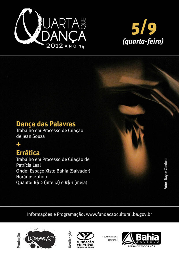 Dez espetáculos, quatro intervenções urbanas e três danças de rua compõem a programação da 16ª edição do Quarta que Dança, que, a partir de 3 de setembro, promove apresentações em Salvador e mais quatro cidades: Juazeiro, Lauro de Freitas, Mucugê e Porto Seguro. Cada trabalho será encenado duas vezes, em locais diferentes, gratuitamente, contabilizando 34 sessões de uma mostra que seguirá em todas as quartas-feiras até 29 de outubro, num panorama contemporâneo da diversidade da produção em Dança na Bahia. As 17 propostas participantes foram selecionadas dentre 74 inscritas no edital público do projeto, que é promovido pela Fundação Cultural do Estado da Bahia (FUNCEB), entidade vinculada à Secretaria de Cultura do Estado da Bahia (SecultBA). A programação completa pode ser consultada na página www.fundacaocultural.ba.gov.br/qqd. Na data de estreia, um trabalho de cada categoria será apresentado em Salvador. Tudo começará às 16 horas, com a intervenção urbana Cena PARADOX, de Leda Muhana, com o voo dos intérpretes-criadores Maju Passos e Marcelo Galvão, que encenam uma coreografia no ar, a partir da balaustrada da varanda do Palácio Rio Branco, na Praça Municipal. Às 18 horas, na Praça do Campo Grande, terá a dança de rua Emobóticos, de Marcos Muniz, inspirado num clima futurista e em filmes de ficção cientifica, fazendo máquinas terem ritmo, com acessórios luminosos e batidas eletrônicas. Depois, às 20 horas, o palco do Espaço Xisto Bahia (Barris) sedia a abertura oficial do projeto, marcada com o espetáculo Alfaunosfinitos, do grupo In-Contro, que trata das relações do homem com suas semelhanças e diferenças, partindo do ponto de vista de que somos apenas parte de um sistema pré-organizado, denominado cosmo. Ao longo das nove semanas, em Salvador e Região Metropolitana, os espetáculos estão escalados para o Centro Cultural Plataforma, Cine-Teatro Solar Boa Vista, Espaço Cultural Alagados, Espaço Xisto Bahia ou Cine-Teatro Lauro de Freitas. Estes espaços culturais públicos são integrados em parceria com a Diretoria de Espaços Culturais da Superintendência de Desenvolvimento Territorial da Cultura (Sudecult/SecultBA), que se completa com a participação do Centro de Cultura de Porto Seguro. Já as performances ao ar livre – intervenções urbanas e danças de rua – acontecem em ambientes urbanos da capital, assim como as sessões que ocorrerão em Juazeiro e Mucugê. Cada proposta integrante receberá um cachê total de 7 mil, para os espetáculos, e de R$ 5 mil, para intervenções urbanas e danças de rua, totalizando R$ 105 mil. O deslocamento entre municípios, hospedagem e alimentação em caso de viagem são também custeados pela FUNCEB. Novidades – Para o coordenador de Dança da FUNCEB, Matias Santiago, o Quarta que Dança é um projeto importante na difusão da Dança na Bahia. “Esse ano, teremos pela primeira vez no projeto uma intervenção urbana do interior sendo encenada em Salvador: E Se Você Fosse, de Cleybson Lima, de Juazeiro”. Segundo Matias, o projeto contempla as várias tendências e modalidades da dança: contemporânea, moderna, dança de rua, experimentação, performances, dança das academias. “A gente está trazendo o trabalho das academias de dança da Bahia. Isso é muito bom. O público terá um mosaico legal das várias tendências da dança. A produção artística do interior está ganhando mais espaço. O intercâmbio entre os grupos e bailarinos é muito interessante. As intervenções urbanas, a dança de rua, as mudanças no ritmo de dançar e de conceber as coreografias: tudo isso a gente vê no Quarta que Dança”. LISTA COMPLETA DOS TRABALHOS PARTICIPANTES QUARTA QUE DANÇA 2014 Espetáculos = [...deixe que eu fique contigo por uma hora apenas...] Fragmentos de uma Solidão, do Grupo Sonho de Valsa = 7, de Jorge Silva Cia. de Dança = Alfaunosfinitos, do In-Contro = Balacochê, da Bamberg Cia. de Dança = Do Abstrato ao Concreto, da Corpo Sísmico Cia. de Dança = Farpas e Lâminas de um Corpo Visível, de João Perene Núcleo de Investigação Coreográfica = Ícaro, de Dejalmir Melo = Para Sempre Isadora, da Contemporânea Ensemble = Partes de Um Todo, do Grupo Experimental de Jazz = Sons e Sombras, de Flor Violeta Intervenções Urbanas = Antítese, da Liga do Corpo = Cena PARADOX, de Leda Muhana = Contactos, do Grupo Independente de Rua = E se você fosse?, de Cleybson Lima Danças de Rua = Emobóticos, de Marcos Muniz = UrbaLove, de Janderson Passos = We can do it!, de Michelle Arcanjo QUARTA QUE DANÇA 2014 Quando: 3 de setembro a 29 de outubro, às quartas-feiras Quanto: Gratuito Produção: Mil Produções Artísticas Parceria: DEC/ Sudecult Realização: Dirart/ FUNCEB/ SecultBA www.fundacaocultural.ba.gov.br/qqd APRESENTAÇÕES DA ESTREIA – 3 DE SETEMBRO Cena PARADOX, 16h, no Palácio Rio Branco Emobóticos, 18h, na Praça do Campo Grande Alfaunosfinitos, 20h, no Espaço Xisto Bahia
