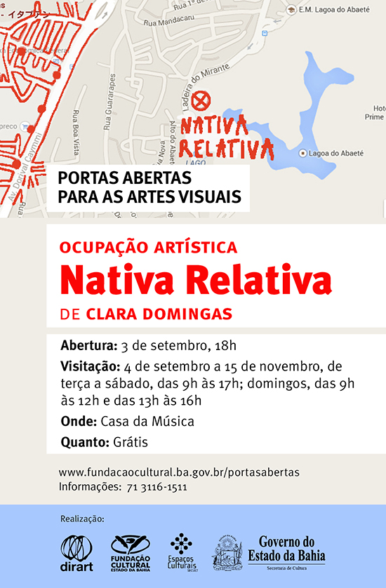 Depois de passar vários anos longe do local onde nasceu e cresceu, o famoso bairro de Itapuã, em Salvador, a artista Clara Domingas realiza a ocupação artística Nativa Relativa na região, entre os dias 3 de setembro e 15 de novembro. O trabalho foi iniciado em 2011 e busca uma convivência criativa e propositiva com a comunidade, tendo como ponto de partida o desejo de processar criativamente o retorno à “casa”, envolvendo de diferentes maneiras os “outros”. Espalhando retratos em muros do espaço urbano e com uma exposição na Casa da Música, localizada na Lagoa do Abaeté, o projeto foi um dos selecionados do edital Portas Abertas para as Artes Visuais 2013, promovido pela Fundação Cultural do Estado da Bahia (FUNCEB), entidade vinculada à Secretaria de Cultura do Estado da Bahia (SecultBA), em parceria com a Superintendência de Desenvolvimento Territorial da Cultura (Sudecult), através de sua Diretoria de Espaços Culturais (DEC).