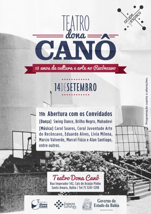 O Teatro que representa a simplicidade e a forte presença da cultura popular do povo de Santo Amaro está fazendo mais um aniversário. Na data em que completa 13 anos, 14 de setembro, o Espaço recebe os cantores Lívia Milena e Marcio Valverde, Carol Castro, Marcel Fiúza, Val Caetano e o Coral Juventude Arte do Recôncavo, além dos grupos de dança Mahadevi, Brilho Negro, Swing Dance e muito mais. O teatro, administrado pela Diretoria de Espaços Culturais da SecultBA tem a importância de ser o principal equipamento cultural  da região. Com 274 lugares, ótimas instalações e acústica, é um dos melhores teatros da Bahia recebendo durante esses 13 anos, elogios de artistas e convidados. Histórico O Teatro Dona Canô abriu as portas no mês de aniversário de Claudionor Vianna Telles Velloso, conhecida nacionalmente como Dona Canô, a matriarca da família mais famosa de Santo Amaro da Purificação, os Veloso. Foi ela que, percebendo a carência de um meio cultural na cidade, buscou junto às autoridades políticas atender as reivindicações da população de Santo Amaro. Sendo assim, o teatro levou o seu nome como homenagem àquela que contribuiu para a cidade. O Teatro foi inaugurado em 14 de setembro de 2001. Em pouco mais de uma década de funcionamento, já passaram por seu palco artistas locais e nacionais, através de projetos como “Dona Canô Chamou”, primeiro projeto do espaço, “A Instituição vai ao Teatro, “A Associação vai ao Teatro” e “A Escola Vai ao Teatro”. Programação 19h: Abertura com texto histórico sobre os 13 anos do Teatro Dona Canô 19h15 às 21hs: Apresentação das atrações: Grupo de dança Swing Dance Cantores Lívia Milena e Marcio Valverde Grupo de dança Brilho Negro Cantora Carol Castro Cantor e compositor Eduardo Alves Grupo de Dança Mahadevi Cantor Marcel Fiúza (a confirmar) Grupo de dança Hip Hop Cantor e compositor Val Caetano Coral Juventude Arte do Recôncavo Serviço O quê?   13º Aniversário do Teatro Dona Canô Quando? Dia 14 de setembro de  2014 Onde? No Teatro Dona Canô (Rua Imperador 142  Santo Amaro, Bahia) Para mais informações consulte o site: espacosculturaisbahia.org