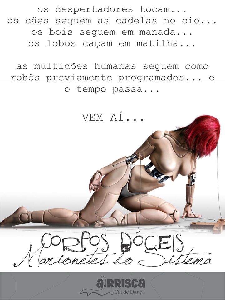 Em Corpos Dóceis, a A-RRISCA Cia de Dança traz um espetáculo que une as linguagens da Dança Contemporânea, da Música e das Artes Visuais para criar uma reflexão sobre os comportamentos coletivos. A montagem tem coreografia de Érica Ocké, composição musical de Elielton Cabeça, designe gráfico e mídia visual de Jamile Ocké. As apresentações serão às 20 horas do dia 13 e às 19 horas do dia 14.