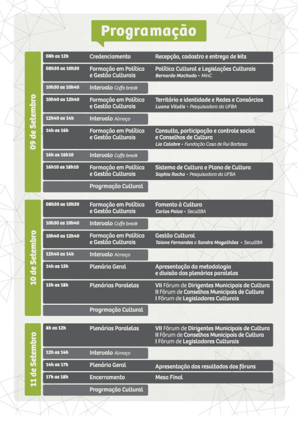 O Evento abrigará o VII Fórum de Dirigentes Municipais de Cultura da Bahia, o II Fórum de Conselhos Municipais de Cultura e o I Fórum de Legisladores da Cultura e contará ainda com um momento de formação com temas presentes na Coleção Políticas e Gestão Culturais, lançada pela Secretaria de Cultura do Estado da Bahia em 2013, dentre os quais Política Cultural, Legislações Culturais, Sistemas de Cultura e Plano de Cultura.