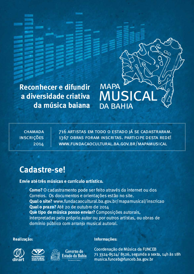 Realizado pela Fundação Cultural do Estado da Bahia (FUNCEB), entidade vinculada à Secretaria de Cultura do Estado da Bahia (SecultBA), o Mapa Musical da Bahia abre sua 3ª chamada, com inscrições até 20 de outubro. Assim, o projeto convoca novos interessados em integrar esta rede, que objetiva mapear, reconhecer e difundir a diversidade da produção musical do estado, além da atualização de dados de artistas já inscritos, compondo um panorama dos cenários musicais existentes nos diversos territórios de identidade baianos. Para participar, o candidato deve ser artista da música atuante no estado e produzir trabalho autoral. Iniciado em 2012, o Mapa Musical da Bahia mantém uma plataforma de difusão da produção musical autoral da Bahia, que pode ser usada como fonte de informações para pesquisadores, produtores, curadores, críticos e público. No ar desde agosto de 2013, o Portal Mapa Musical da Bahia apresenta uma rádio online com obras que foram indicadas por uma curadoria especializada nas chamadas realizadas em 2012 e 2013. No total, foram 518 compositores e músicos inscritos e 995 obras cadastradas em 2012. Já em 2013, na segunda chamada, foram mais 198 inscritos e 372 obras. Ou seja: em dois anos de Mapa Musical, foram mapeados 716 artistas e 1367 obras musicais da Bahia. Os desdobramentos do Mapa Musical envolvem ainda uma parceria com a Rádio Educadora FM (107,5), que veicula semanalmente programas apresentando artistas cadastrados no projeto. Está em andamento também a produção de uma coletânea de cinco discos, com previsão de lançamento ainda para este ano. Além disso, o projeto Mapa Musical da Bahia 2014/2015 foi contemplado pelo 1º Edital de Fortalecimento do Sistema Nacional de Cultura (SNC), realizado pelo Ministério da Cultura (MinC), por meio da Secretaria de Articulação Institucional (SAI), no eixo “Fomento à Produção e Circulação de Bens Culturais”. A seleção vai repassar R$ 2,5 milhões do Fundo Nacional de Cultura (FNC), que serão somados a uma contrapartida de R$ 625 mil do Governo da Bahia, para um investimento total de R$ 3,125 milhões na difusão da diversidade da produção musical da Bahia, com a realização de 108 shows nos 27 territórios de identidade baianos, dois grandes festivais e cinco oficinas de qualificação, além da reformulação do portal, com novas ferramentas e melhor navegação; criação de aplicativo para smartphones e tablets; e produção de mais coletâneas. COMO SE INSCREVER – Para participar do cadastro, os músicos e compositores devem apresentar o seu trabalho através de ao menos um e no máximo três registros de áudio, com músicas que podem ser composições autorais, interpretadas pelo próprio autor ou por outros músicos/cantores, e obras de domínio público com arranjo musical autoral. A participação é aberta a pessoas físicas, exclusivamente para autores das obras a serem apresentadas. As inscrições podem ser feitas através de sistema online disponível no hotsite Mapa Musical, ou pelos Correios, com envio do Formulário de Inscrição, documento disponível para download na mesma página, acompanhado de um CD com as músicas, através de serviço Sedex ou Carta Registrada, com Aviso de Recebimento (AR). Mais informações: Portal Mapa Musical da Bahia Cadastro online, documentos, regulamento e orientações Coordenação de Música da FUNCEB 71 3324-8524/ 3324-8526, segunda a sexta, 14h às 18h musica.funceb@funceb.ba.gov.br Realização: Dirart/ FUNCEB/ SecultBA